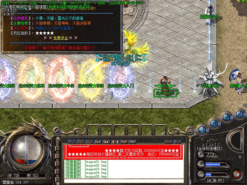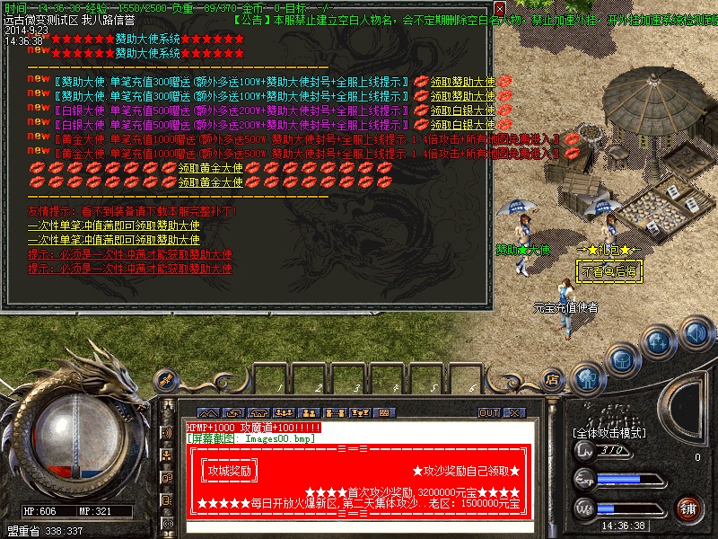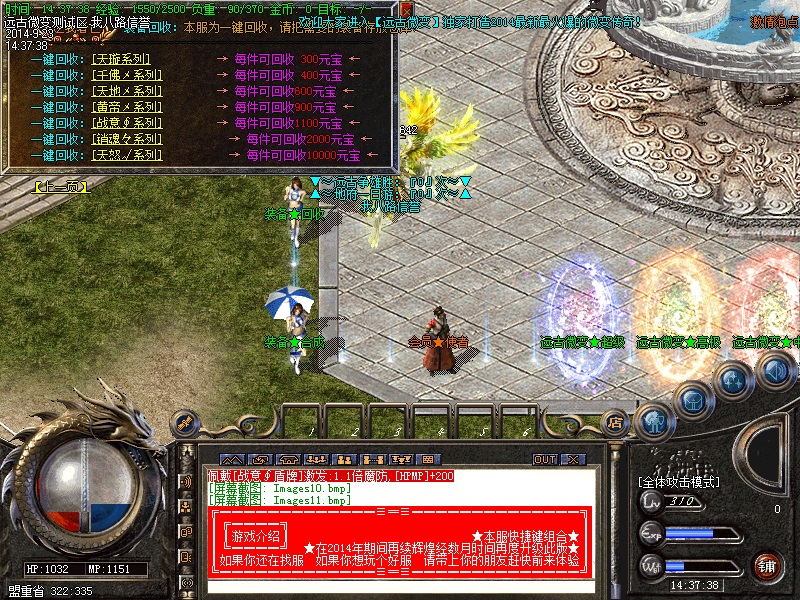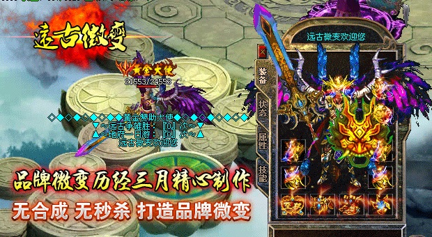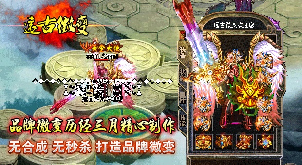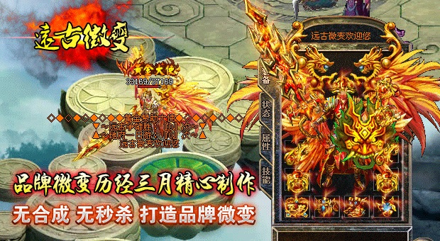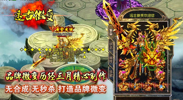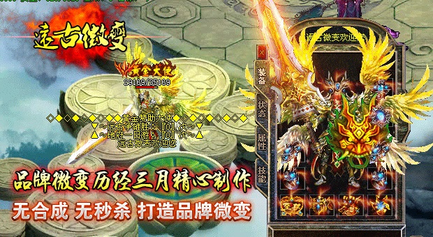 欢迎大家进入传奇开区一条龙【远古微变】独家打造最新最火爆的微变传奇!本区已经正式开放,数据保留,请放心充值.本服无任何GM,无任何客服QQ,无任何管理.元宝比例短信1:10000 点卡多送80% 网银多送100%.特级活动,专爆幸运石,专爆仙器.行会争霸,武林大会,土城跑酷,各种终极都有暴!90级以上地图,暴本服所有装备,等级要求越高的地图暴率越高!本游戏是一款无合成,无秒杀的游戏,是真正意义上的微变版本,完美设置,以散人为核心,让游戏更加激情!击杀BOSS全服通告,可自动获得元宝,超高经验,(大小BOSS都有获得,当然越高级BOSS获得奖励越丰富).