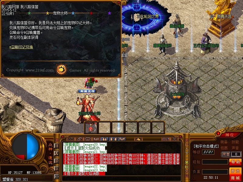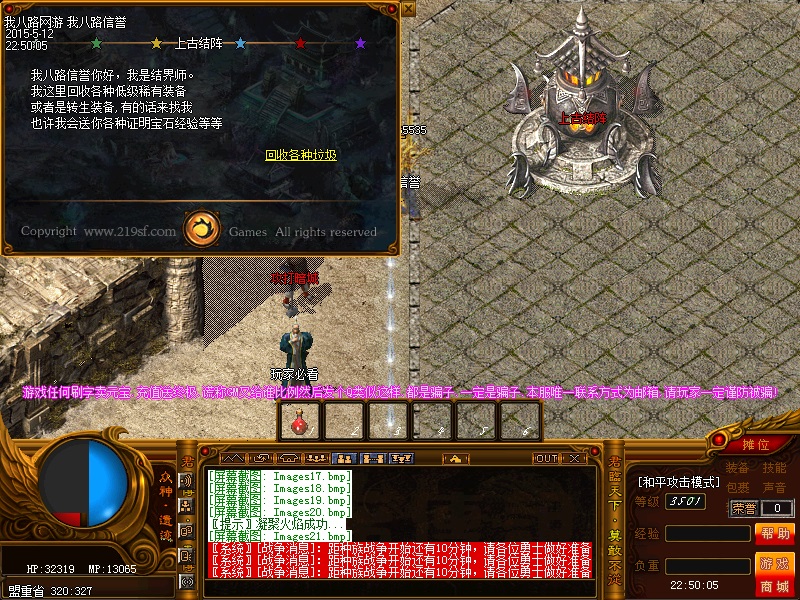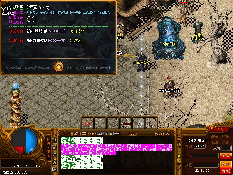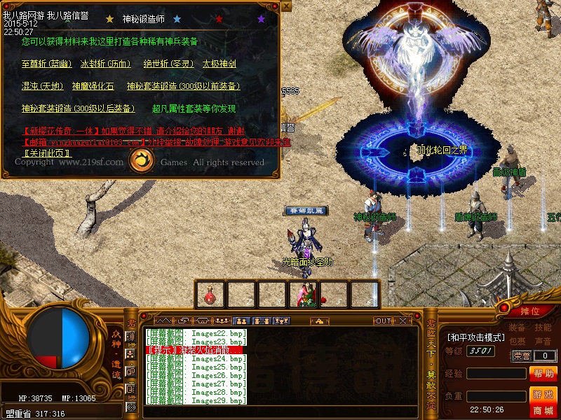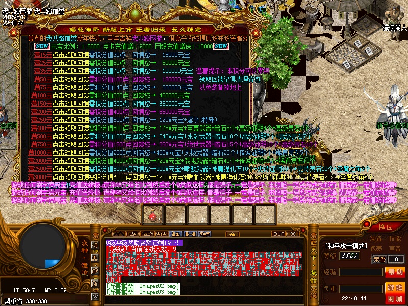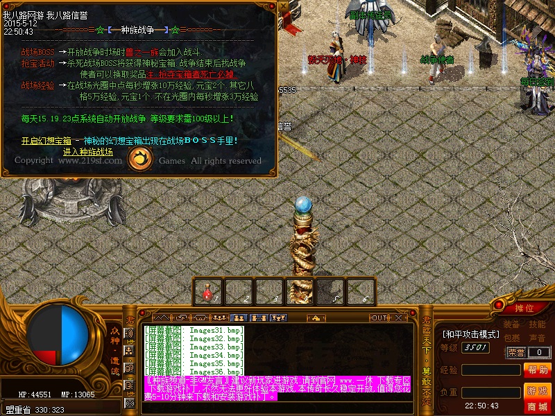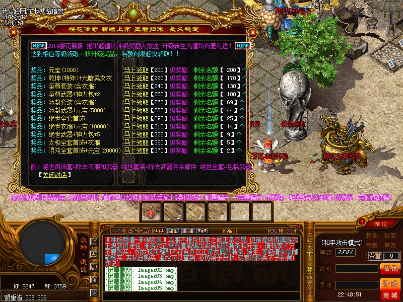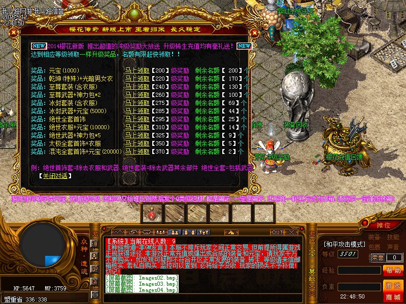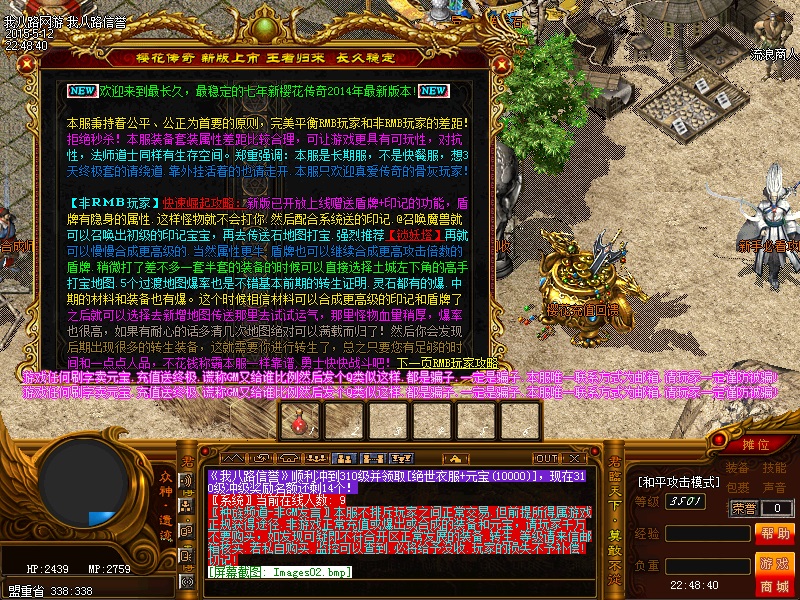欢迎来到传奇私服一条龙新版新樱花传奇,上线自动赠送盾牌和印记,新手起步毫无压力,传送石地图都可以打,更加容易的向高手行列冲击。每天下午的3点-4点.7点-8点.11-12点会开3次(种族战场),玩家自己手动跑到100-100的坐标,里面有大量经验,元宝喷射!更不要错过土城砍猪点每半个小时的活动怪物,甚至可以爆到绝世装备哦!各大活动怪物爆率超高,不容错过!