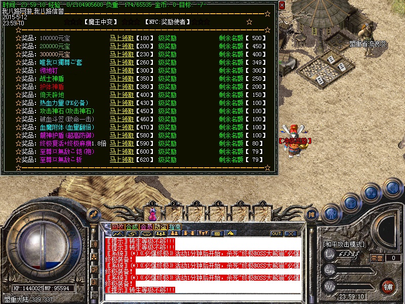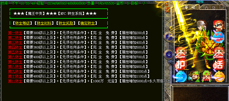 传奇开区一条龙更新转生系统,1-11转,转生后每转都可以获得相应属性点,每转可获得强悍技能.详情请看转生服务.全国独家首创四皇冠最新系统,分为红,紫,蓝,金-四皇冠,像征贵族身份!每天12:00 16:00 21:00 必暴终极活动,大熊猫送充气娃娃,暴本服终极装备,暴率超高!请不要用系统默认的日期,帐号密码不要过于简单,密保情牢记,帐号被盗,概不负责!传奇开区一条龙技术新增【终极两件套】唯一牛比属性,被砍中者掉等级,请注意防范,还有超高的属性哦!每天11:00-20:00之间每3小时开启一次,土药掉落大量元宝+高级装备+超级血灵!每天23:00-23:45举行[行会争霸战],最终获胜的行会每人可领取[500万元宝].每天下午7点,各城市安全区刷1只【神马王子】,杀死后一定机率爆[终极装备].每天14:00-14:30举行[群英争夺战],最终获胜者可领取[1千万元宝].每隔1小时系统自动开启一次,杀死[元宝树妖]可获得大量元宝。活动时间:15-15:30  18-18:30  21-21:30 每天开放3次,每次半小时.