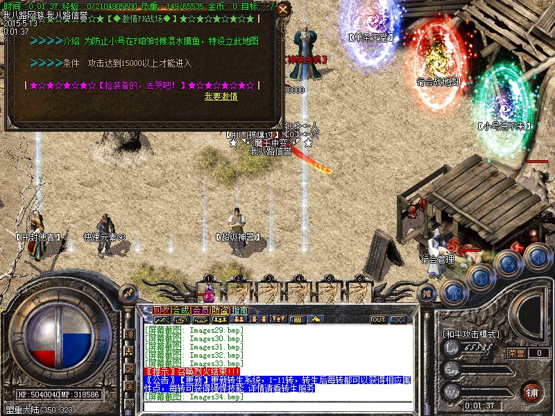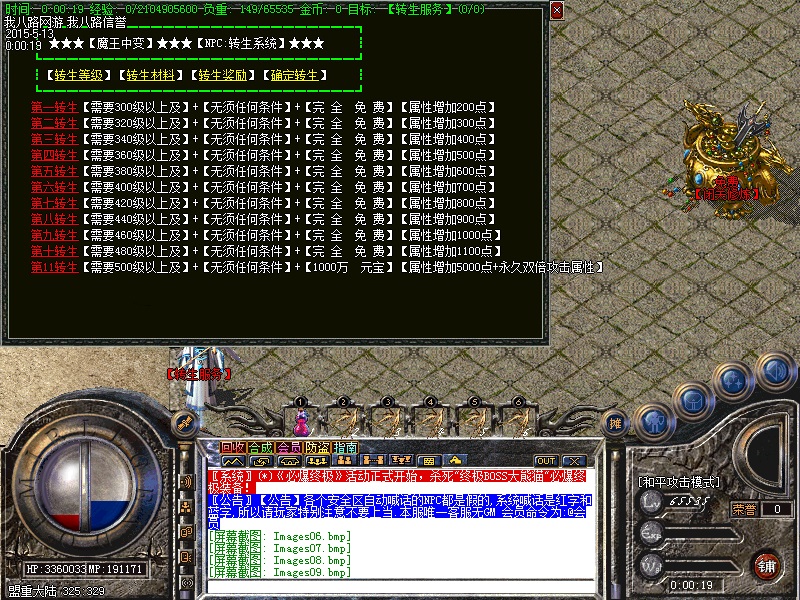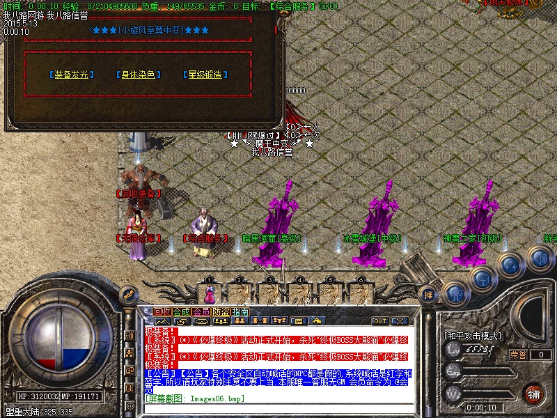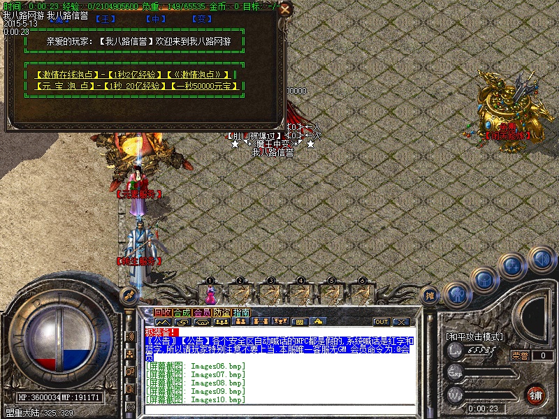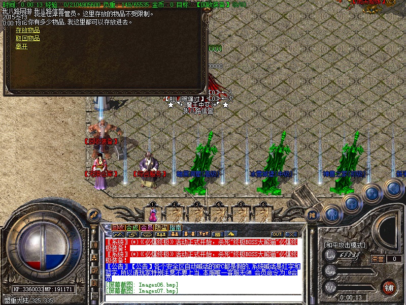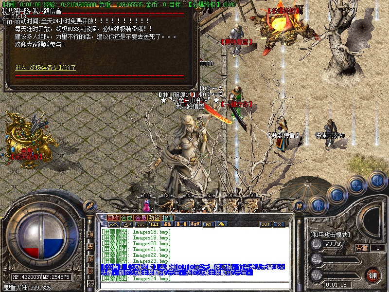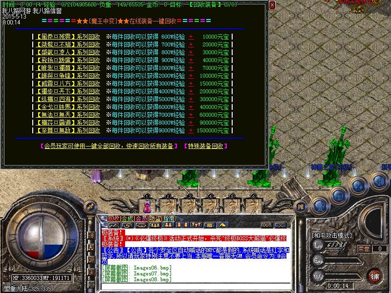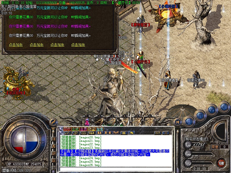 游戏内各个安全区自动喊话的NPC都是假的,系统喊话是红字和蓝字,所以传奇开区一条龙请玩家特别注意不要上当.无客服无GM 会员命令为:@会员.为了方便大家打元宝新增加会员在线一键回收  @回收  可以回收装备!新区开区第2天集体攻城,行会老大无需递交头像,新区沙城主奖励5亿元宝,老区沙城主奖励3亿元宝。