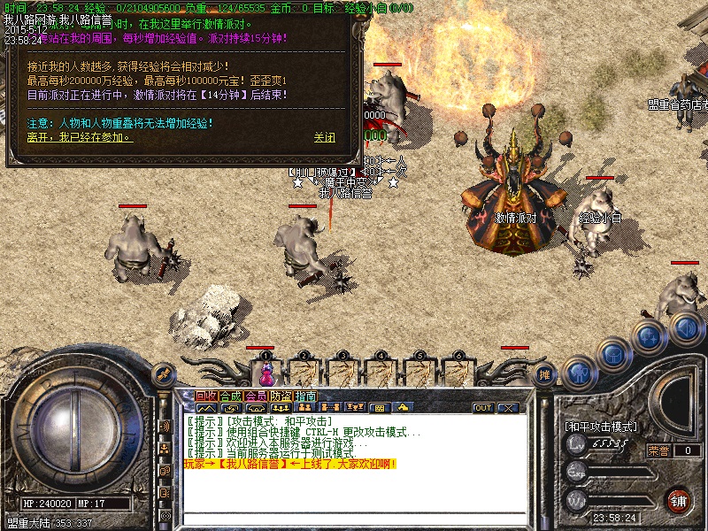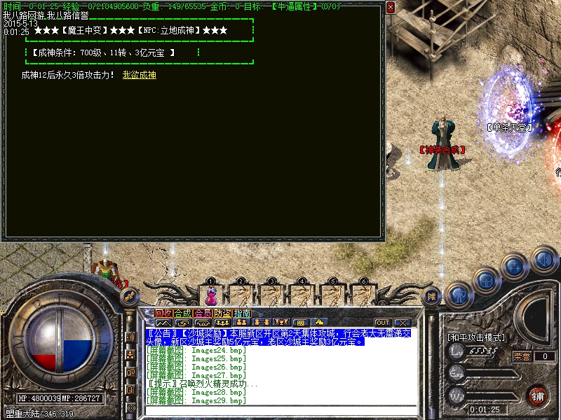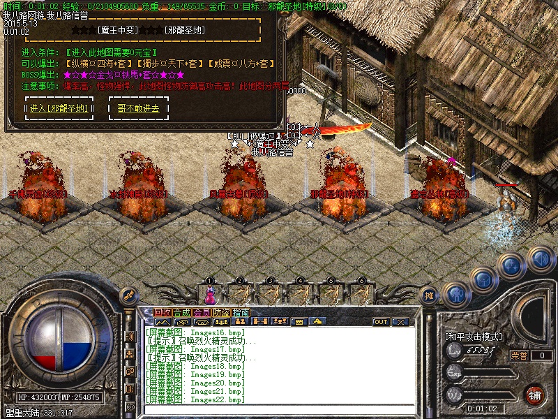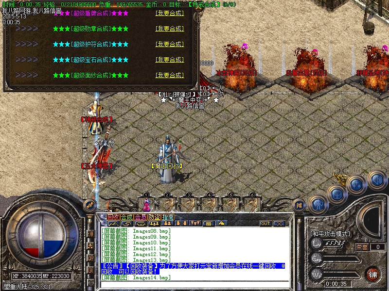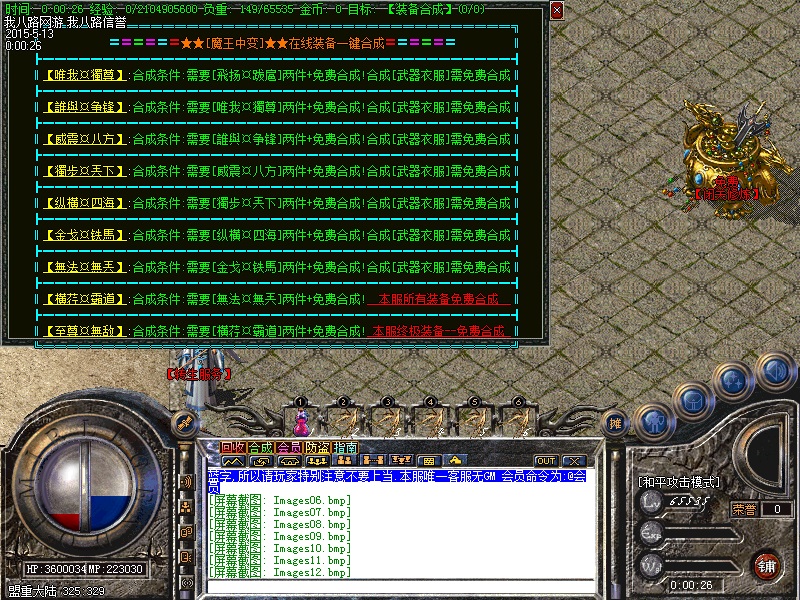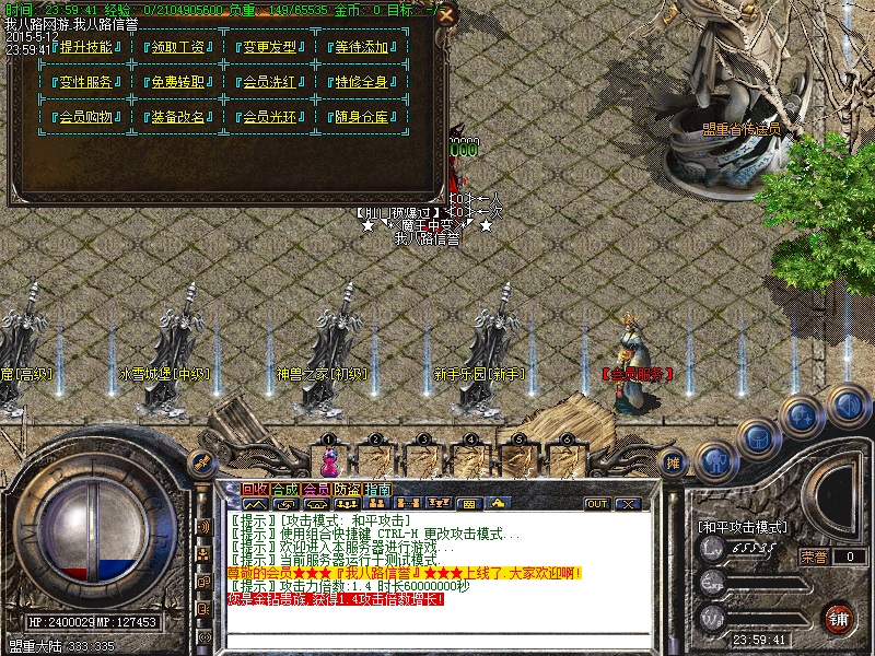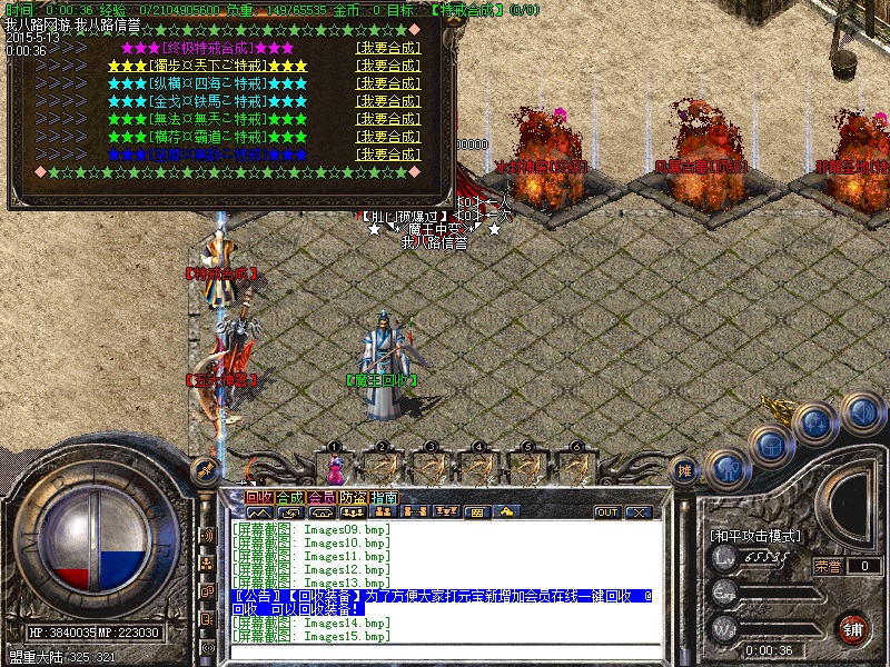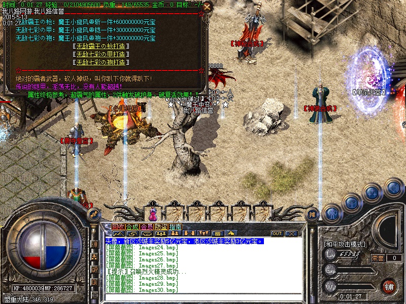 游戏内各个安全区自动喊话的NPC都是假的,系统喊话是红字和蓝字,所以传奇开区一条龙请玩家特别注意不要上当.无客服无GM 会员命令为:@会员.为了方便大家打元宝新增加会员在线一键回收  @回收  可以回收装备!新区开区第2天集体攻城,行会老大无需递交头像,新区沙城主奖励5亿元宝,老区沙城主奖励3亿元宝。