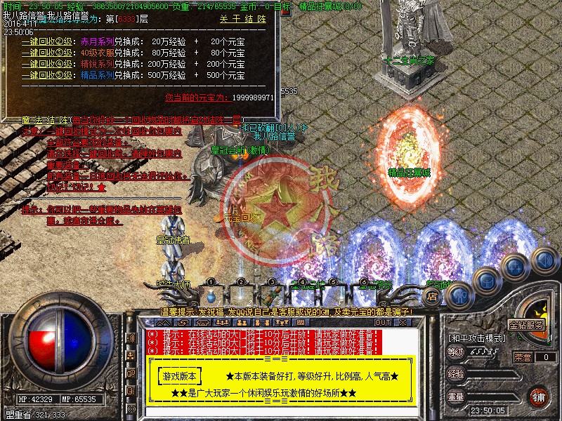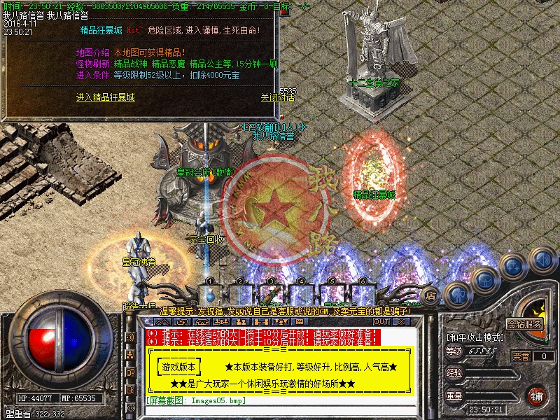 本传奇版本装备好打,等级好升,比例高,人气高,是广大玩家一个休闲娱乐玩激情的好场所。本游戏更新了防外挂系统,配合防外挂登录器封闭了市面上95%的外挂,请玩家放心游戏!执迷不悟者封号处理!欢迎进入精品传奇,我们力争保证:公平,公证,公开,认真对待每一个玩家。本游戏不设管理员,不卖装备,不调级,只出售元宝,购买元宝请自行网上充值!