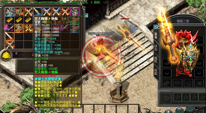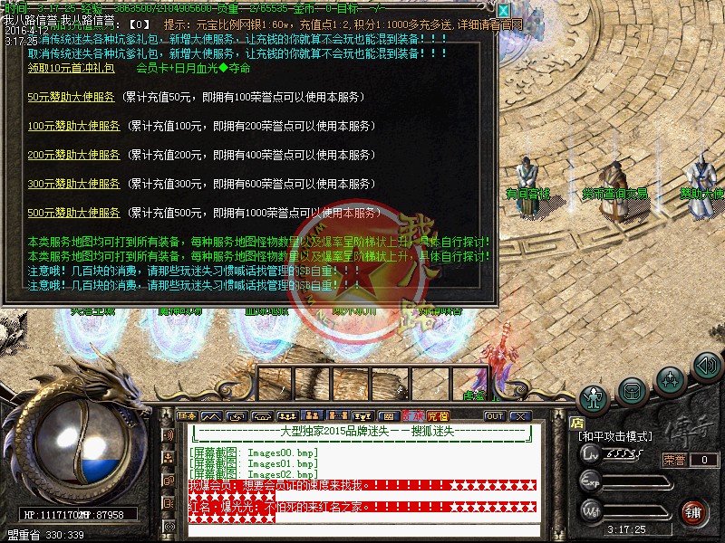 第3季更新内容请到官方网站上面查看。传奇一条龙会员输入@会员,打开会员服务。超多传奇sf一条龙脚本地图,超多装备,独家巨作。游戏详细介绍请登录官方网站。本服强封外挂,开挂者发现一次,直接降0级处理!第二次发现将封号+封机器码。爆不爆谁知道的每两小时刷新一次的搜狐正版大使必报暴富基金,这是好东西哦.本服PK技能超猛,PK靠操作,鄙视一切开挂装逼的SB份子,二季更新礼包超级便宜,基本是充多少送多少,500的赞助大使,充值200多可得。一两百块钱的礼包,请那些仍需要发字找管理的SB自重了。没钱就回家打飞机,莫来服中想装逼。独家奉献[搜狐迷失]。用心铸造快乐!首先本服精心制作装备-属性-爆率-等.达到不花哨-不变态-不死板.本服上线赠送10转,非常方便散人发展 升级进服查看ncp详细介绍,泡到顶级-即送丰富奖励-即可开战!挑BOOS 斩小鬼都随你!攻城战在第二天晚上20:00开始,22:00结束沙城战,丰厚奖励....本服转生不难,散人有时间不花钱也能满转 有时间大过有钱......散人BOSS野外BOOS随你杀,转生卷等级卷都好爆 更多活动等你拿,完美的属性搭配,杜绝秒杀-激情pk-擂台争霸-杀人越货-等你参与。
