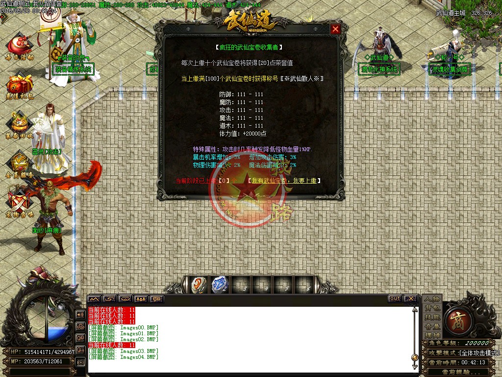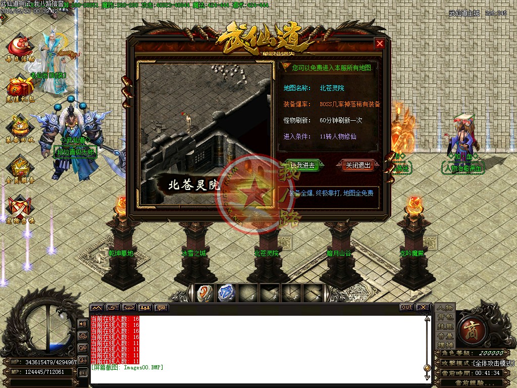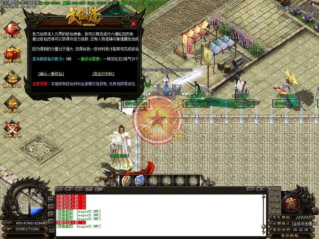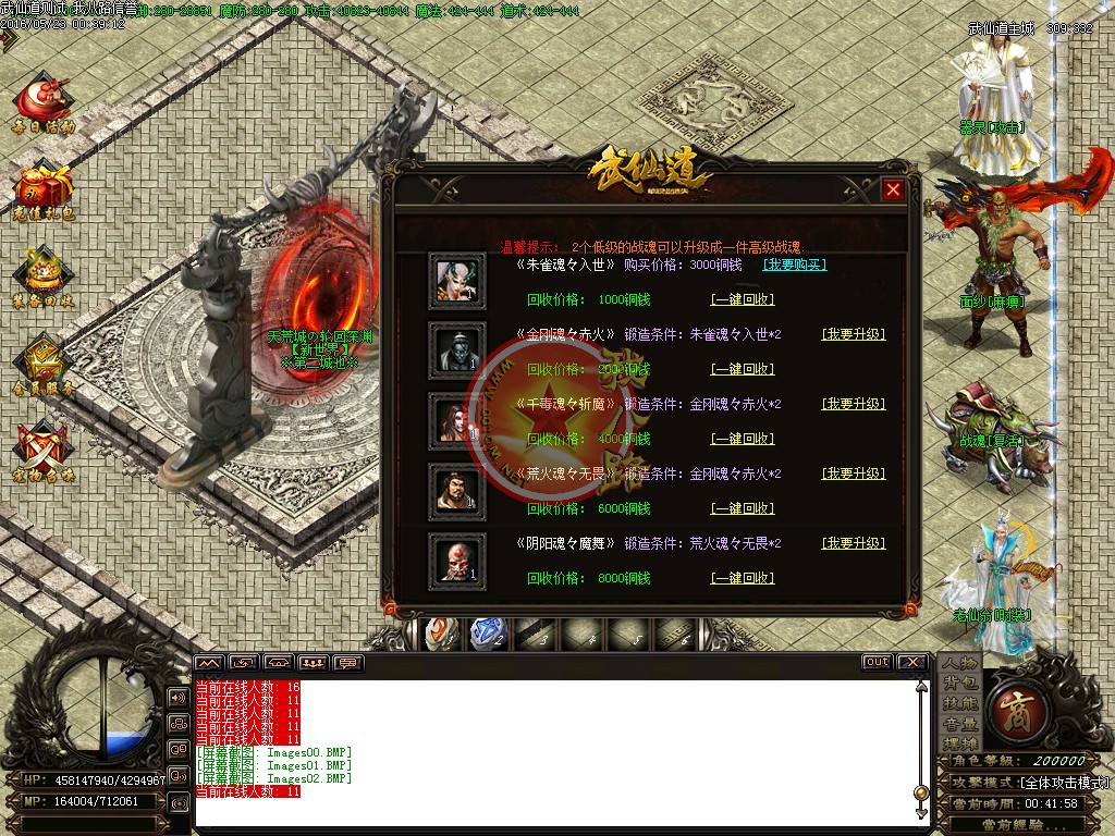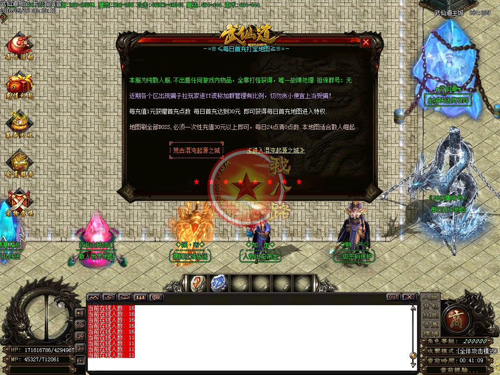 武仙道单职业传奇版本禁止建立空白人物空白账号,合区自动删除空白人物空白账号!所有BOSS每杀一次都会爆出大量铜钱和武仙币,有利于散人发展!人物等级上线泡点保送200级,200级-300级靠打怪,参加活动和吃等级丹来升级,300级以后靠吃等级丹,各大地图爆率超级高。