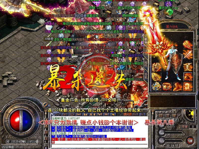 本F上线轻松泡点1000,PK激情无秒杀,杀人超爽,技能超狠!百分百激情!22转开始,每转叠加神力倍数不同,从1250级以后开始等级叠加倍数攻击!本服谢绝一切外挂玩家.加速.脱机.一律死封到底!请不要挑战一个让传奇灭亡的铁律!本服装备比较难爆。爆出来的装备神力装备持久越高神力属性越高所以打到装备大家要注意看装备持久哦!游戏里弓箭手模样的怪物多为防脱机怪物,看见千万别打,否则系统会把你抓进监狱..最新修改,兽王地图,狂爆升级丹,散人前期冲级必争之地!本季无比例,终极凭证暴力证明只需300,切勿发黄字找管理谈比例,传奇sf一条龙管理对发黄字谈比例的人直接无视。转生宝宝召唤命令请使用转生召唤术!最新修改所有职业上线自动学习召唤神兽,只为方便散人屌丝。