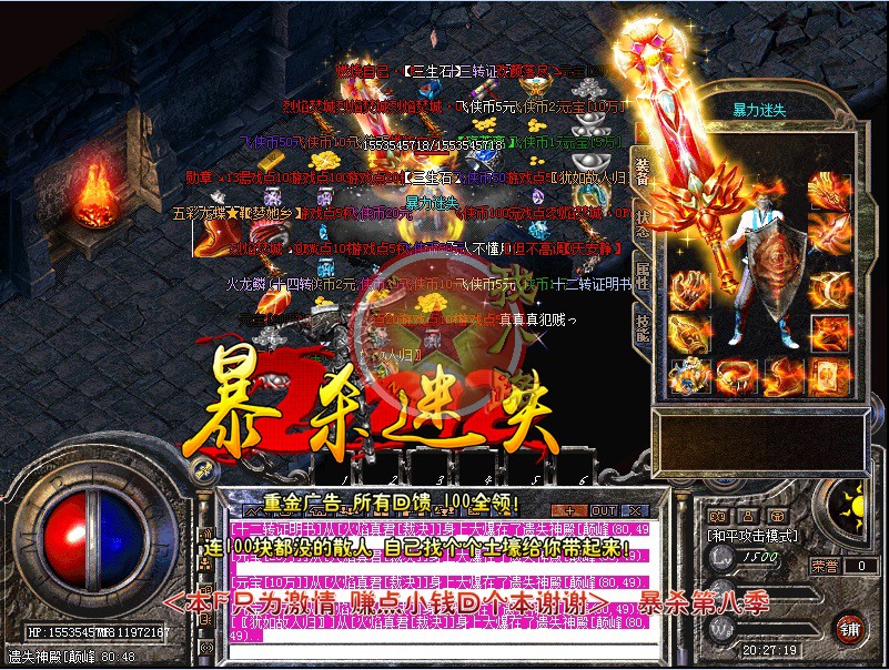 传奇开区一条龙不败独家迷失,全新独家首创,公司化运营,绝对长期、公平、公正、稳定,非三天服,稳定运营,时间来证明!本服装备全部可以打出来.看的只是你的人品.分钱不花的人打出来终极武器.散人打装备全靠RP,充钱的有充值传奇脚本地图,爆率相对散人地图高很多倍.散人进服建议双号,一个号十分钟泡到1000级再去新人地图刷前期发展装备,另一个号直接泡点挂在线时长领各种等级卷跟转身卷,转身等级免费送,给力吧 !新区四倍爆率 真爆 真爽 装备无限 激情到底 让散人也能逆袭 打造中国好迷失 !