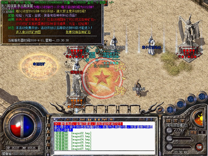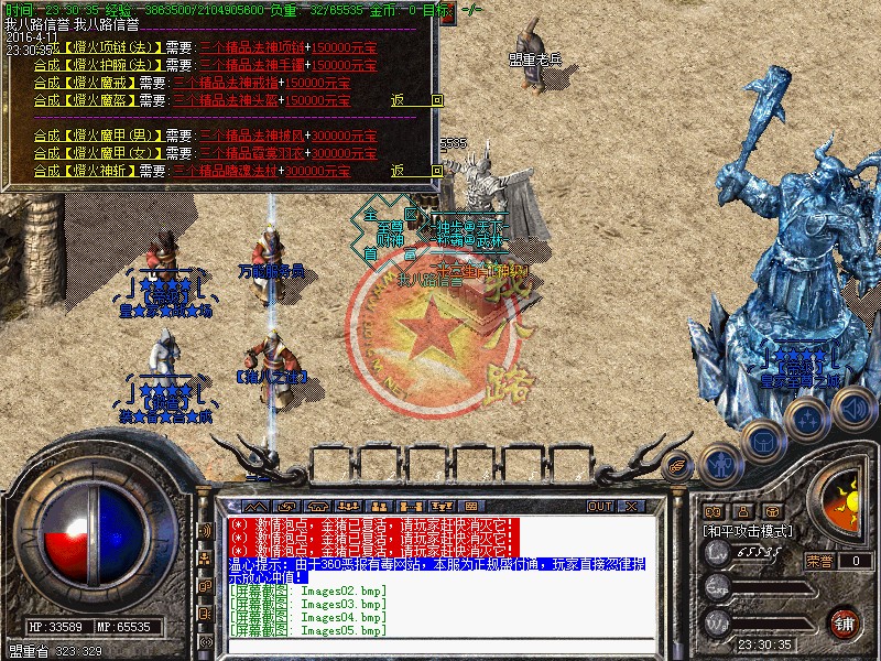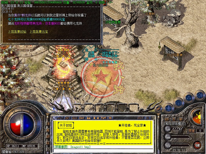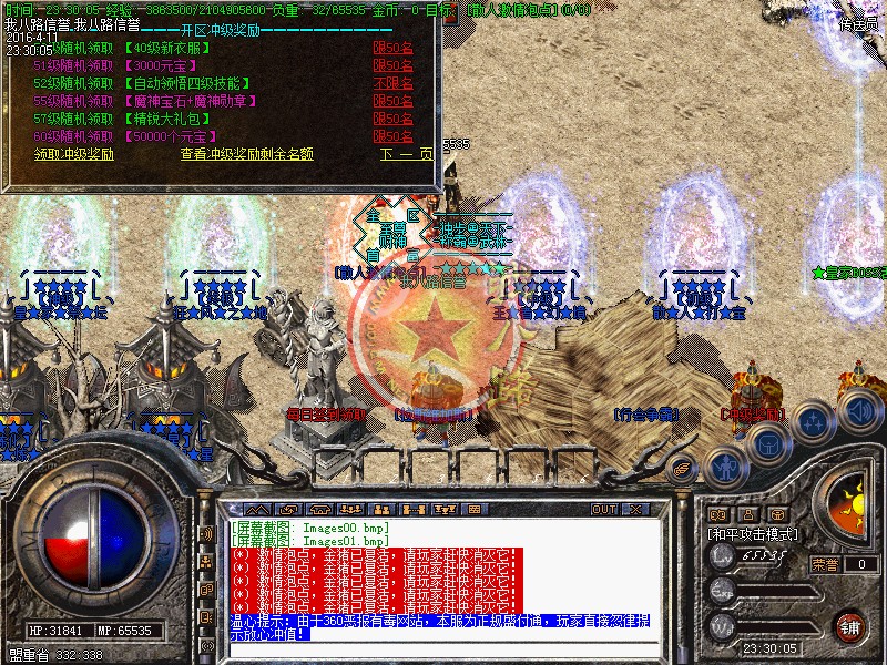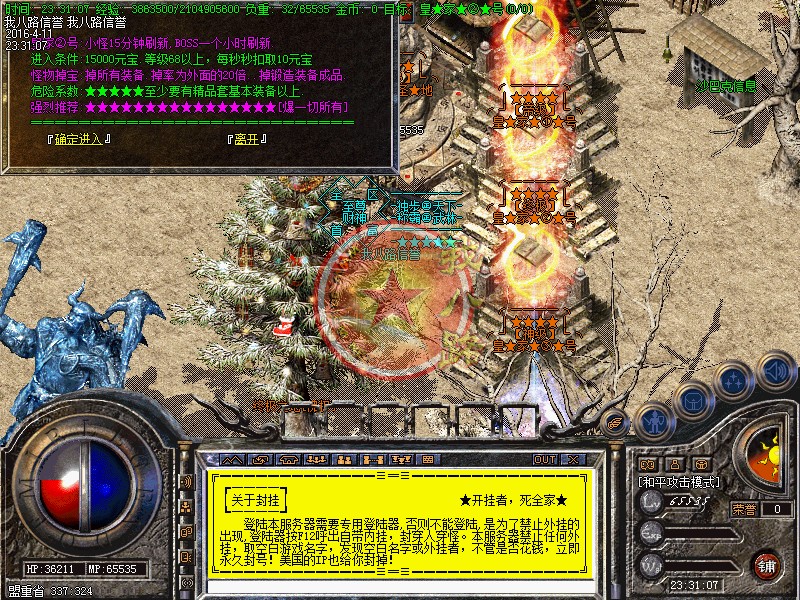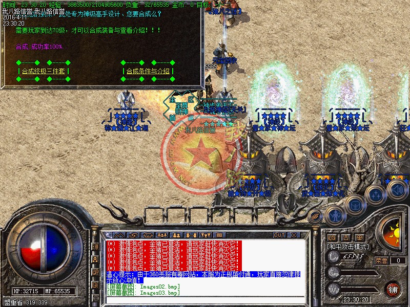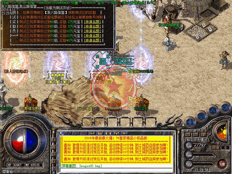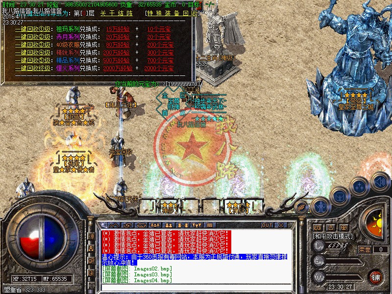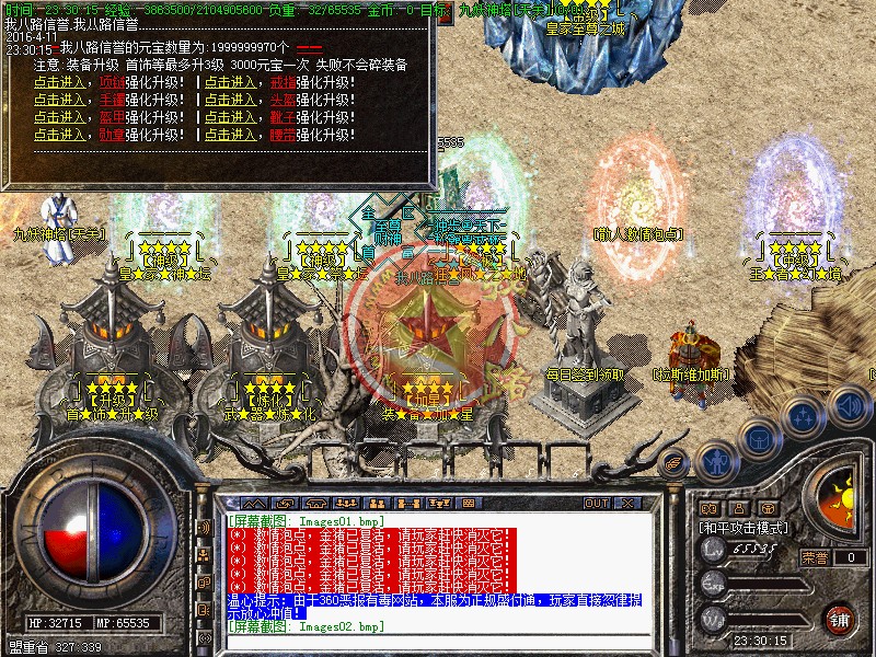本游戏更新了防外挂系统,配合防外挂登录器封闭了市面上95%的外挂,请玩家放心游戏!执迷不悟者封号处理!玩家可以按F12呼出内挂,在[战斗]选项里面可以增加游戏速度!使用(@留言) 命令,若发现任何关于游戏BUG问题,或者好的建议!请及时与我们的服务器故障员联系:老方法:@留言!对服务器有帮助,给与一定奖励!我们始终坚持以你提我改的信念来运行!相信有您的参与精品传奇才会更精彩!举报外挂的方式也一样,或者直接在NPC举报!攻沙奖励自己领取,本服务器拒绝家族,48级号抢沙之间禁止登陆、禁止外援!号角爆率1/1,开区第2,3天统一拿沙 第2天奖励300W元宝(第3天奖励100W),赶快召集玩家争夺这笔以外的财富吧--!官位捐款..黄金武器..拉斯维加斯..冲级大奖..剧情传奇SF一条龙地图..在线回收】每日精彩活动:燕屋寻宝.在线活动.行会争霸.。~触发黄金武器,必须使用(超级祝福油)?或者武器炼化炉!每天中午12点、晚上18点、晚上24点,举行在线活动免费传送到:在线活动场,大量的元宝、经验、装备等着您!每天早上9点-下午15点-晚上20点举行行会争霸活动,获胜行会奖励3000元宝活动都会有系统提示,请玩家准时守侯参加!传奇一条龙服务请妥善保管自己的账号。玩家如果新区与老区账号一样;只需要在账号后面加a、b、c、或重复几个依次排列下去即可!如果玩家账号是满的,后面不可以再加的时候,把最后一个数字或者字母去掉,再加a、b、或者c!即可。