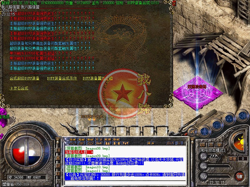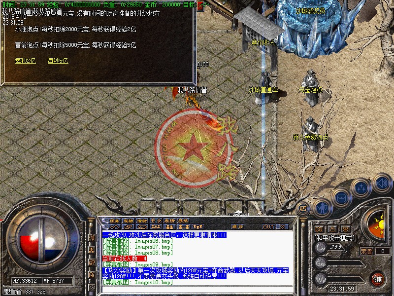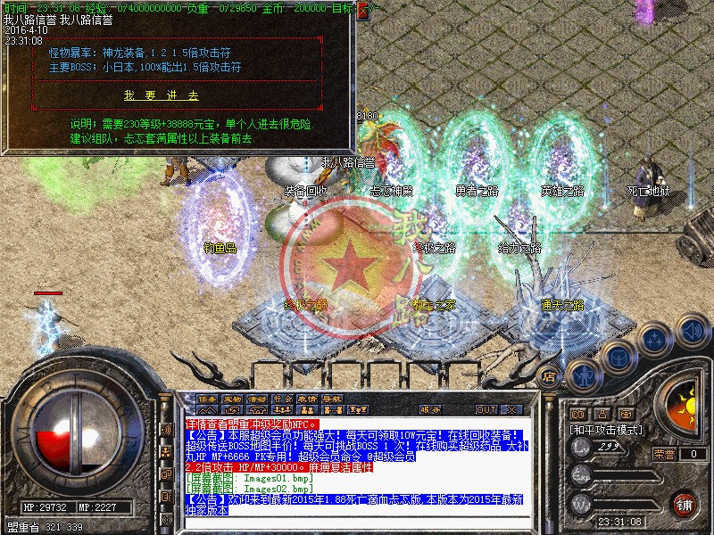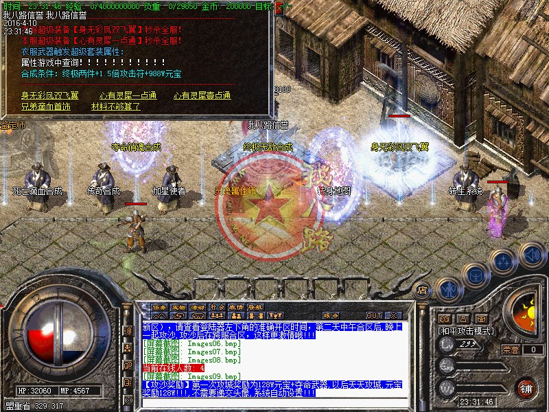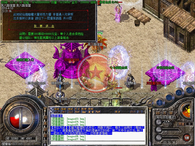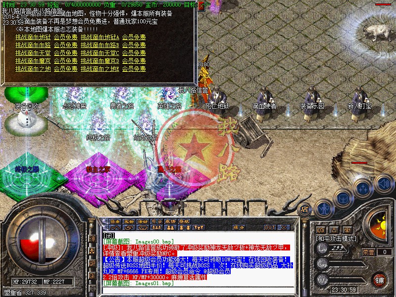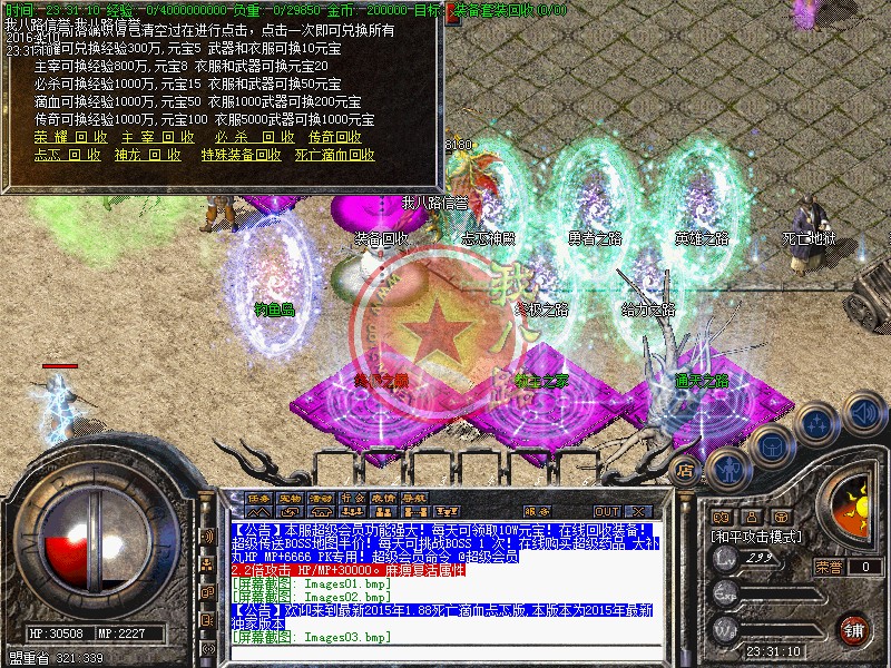 本服为联盟形式开区,同版不同区,每天三站同开(每站三新区),请查看登陆器左下角的准确开区时间,第二天中午合区后,晚上一起攻沙,攻沙后在跨服合区,这样更激情哦!第一次攻城奖励为128W元宝+夺命武器,以后天天攻城,元宝奖励128W!!!,不需要递交头像,系统自动设置!元宝比例1:30000 银行充值多送100%。点卡80%,请到官网充值,避免受当受骗!