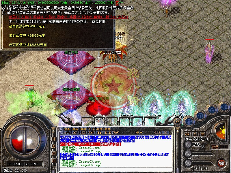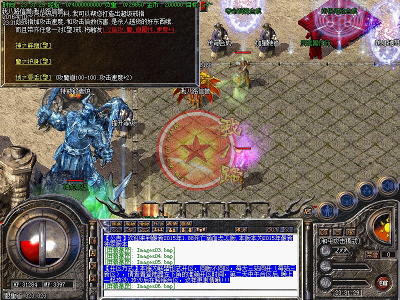 传奇sf一条龙脚本地图和新装备,可以保证你一直玩下去,一直激情,一直合区,绝对不会出现死区和空区==没有应死区退服的,只有被激情打退服的。可回收玩家打出来的各种装备及各种新衣服.可以在土兑换NPC那里换取元宝。神之麻痹,地之复活,魔之护身带齐任意一对,触发攻击倍数:1.1倍攻击属性。神之麻痹[聖],地之复活[聖],魔之护身[聖]带齐任意一对,触发攻击倍数:1.2倍攻击属性。关于道士太强的问题,道士也只限前期强,宝宝攻击高,好打装备,后期攻城,打群架,只能起辅助作用!