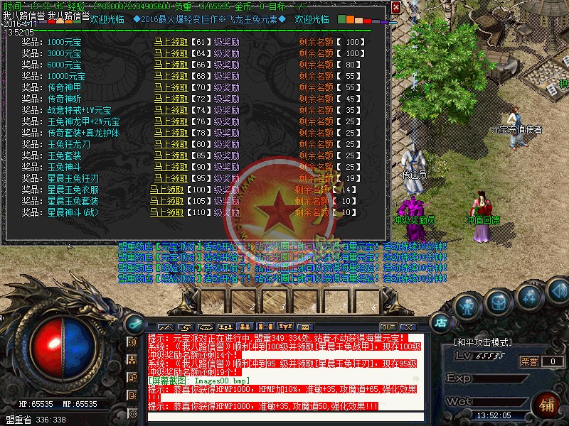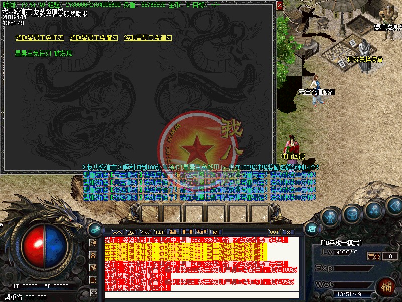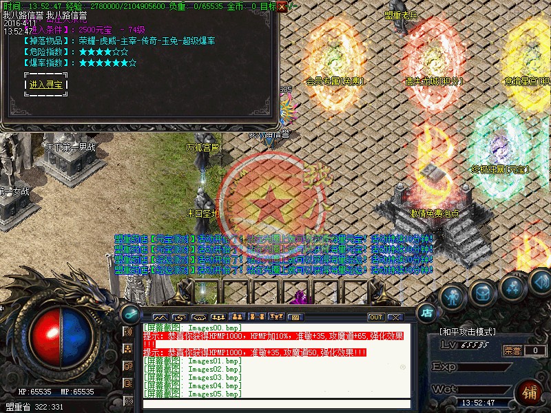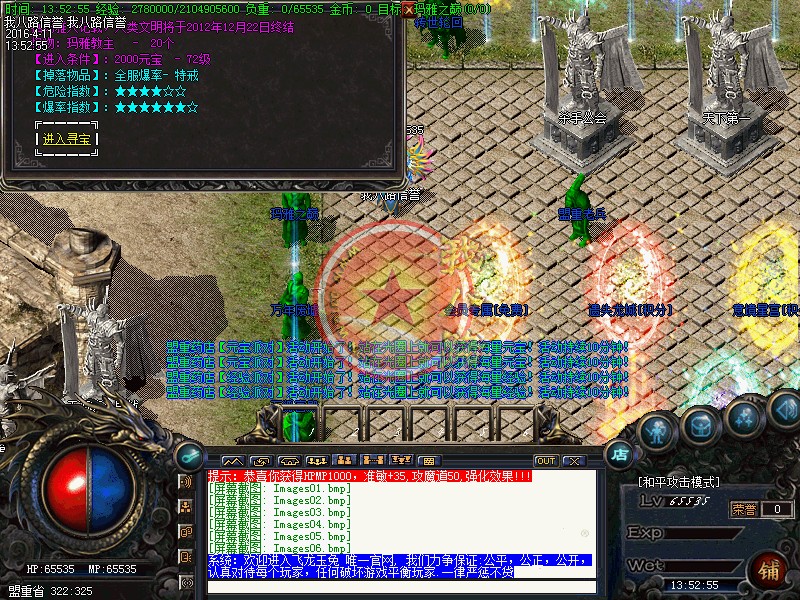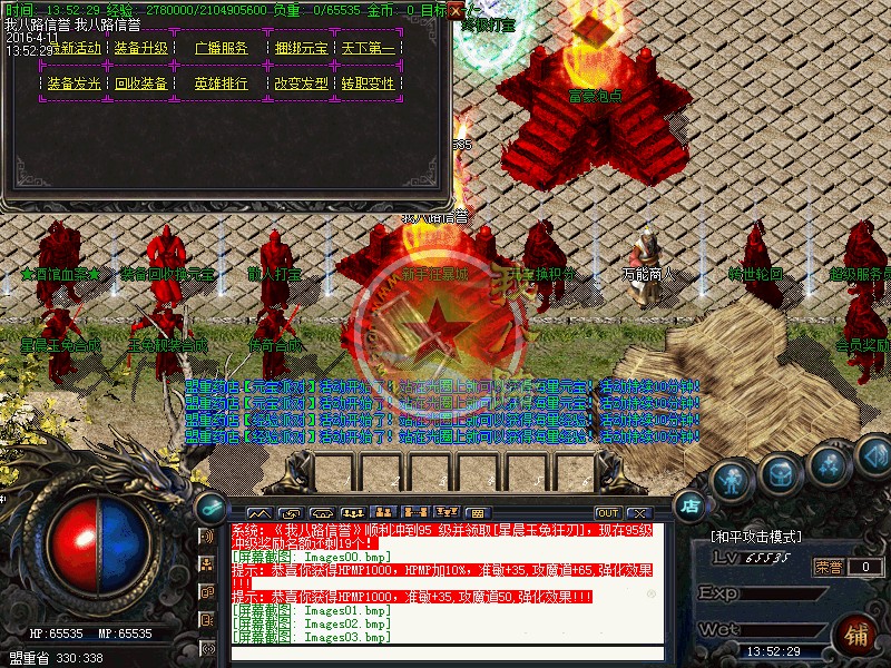 本传奇版本设激情休息间免费泡点!安全区域得经验68888,还可砍元宝!新区开放一小时后停止砍元宝活动!非安全区域得经验98888!新区第二天攻沙!老区天天攻沙,统一奖励100W元宝!冲级奖励火爆进行中,冲级奖励元宝,送套装!名额有限!开外挂的玩家一律关监狱处理.需要高额保释金才能重新获得自由!使用脱机外挂一律封号并追究大号!本服在原版本的基础上,爆率、回收提高三倍以上,只要花时间,装备全爆,绝对散人天堂!传奇一条龙会员相应等级送套装!请到土城右下角会员奖励处或激情休息间领取,会员拥有专属免费泡点到顶级,专属免费地图.随身买药.免费洗红等特权。传奇一条龙技术人员经数月时间为玩家打造了装备加星和元素系统,保证独家制作!小装备大梦想.新玩法.新概念.精益求精.让你的装备永远超人一等战士,道士,法师:三职技能平衡.(装备全爆) 装备属性均经精准调试,不变态,不秒杀!