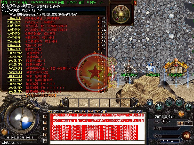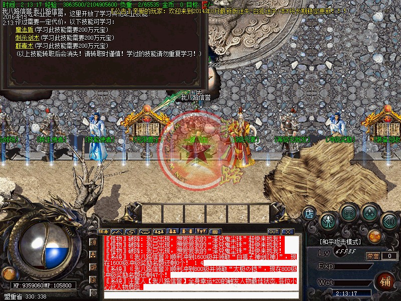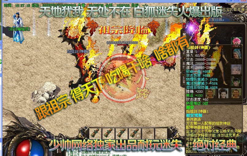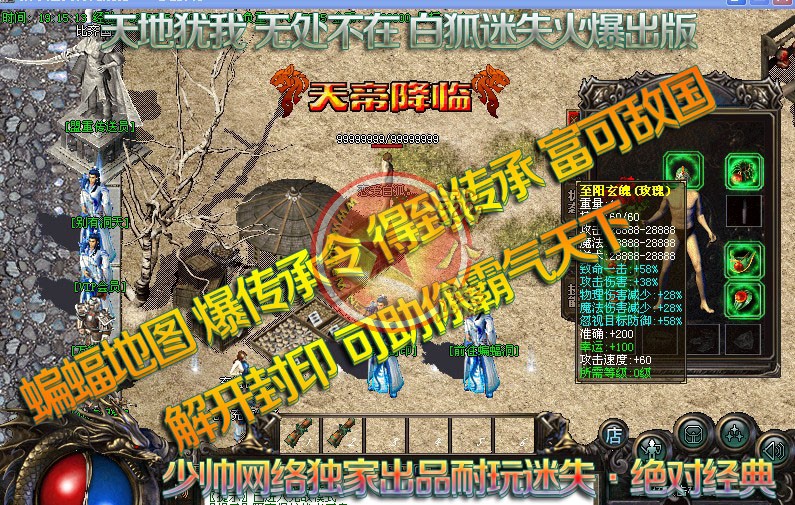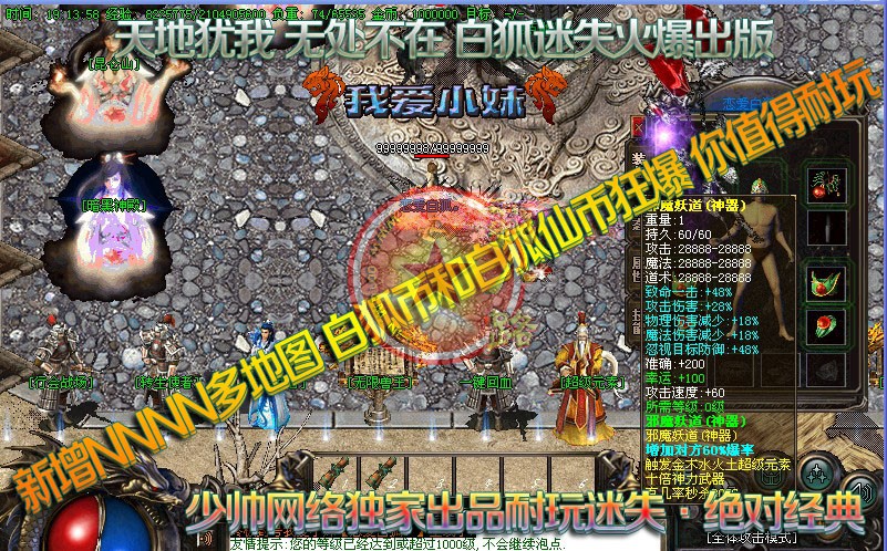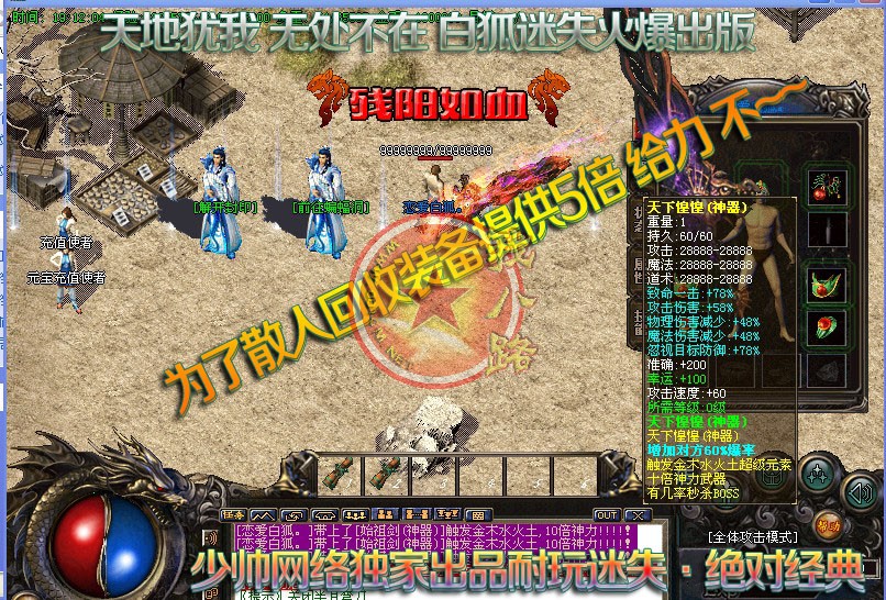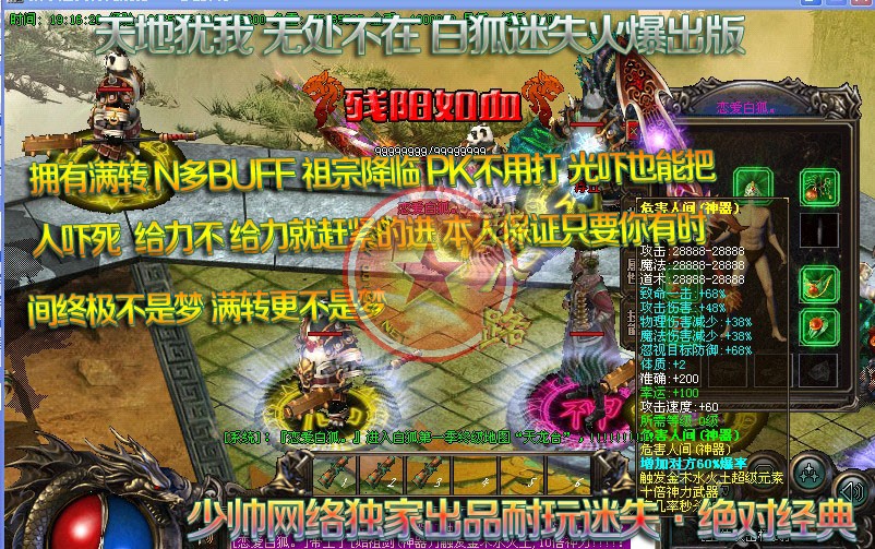 欢迎来到传奇一条龙最新版迷失-白狐迷失!本F将长期稳定更新!本服GM不参与游戏。游戏喊话卖元宝的都是骗子,元宝比例1比10万,点卡网银赠送:100%!本服一共31转,14转后可召唤宝宝,命令“@转生召唤”!