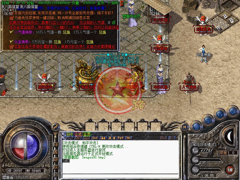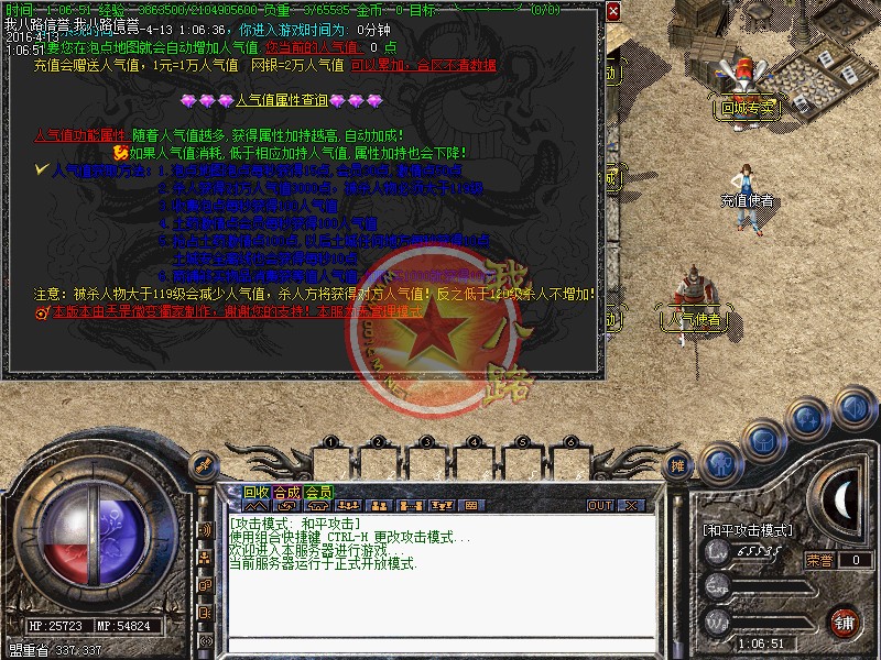 本服是无GM模式,请到官方网站:下载完整补丁体验游戏乐趣!本服禁止建立空白人物名,会不定期删除空白名人物!本服獨創人气值系统,无人民币和非人民币之分,杀人、被杀、泡点均可获得和减少人气值,相应人气值获得相应属性加持! 特色玩法、独家鉴定、免费合成、免费转生、顶级装备靠打,绝不吹牛!长久耐玩服,你还等待什么。职业平衡抛弃市场上现有的多类复杂坑爹玩法,一切回归简单、靠打的乐趣!