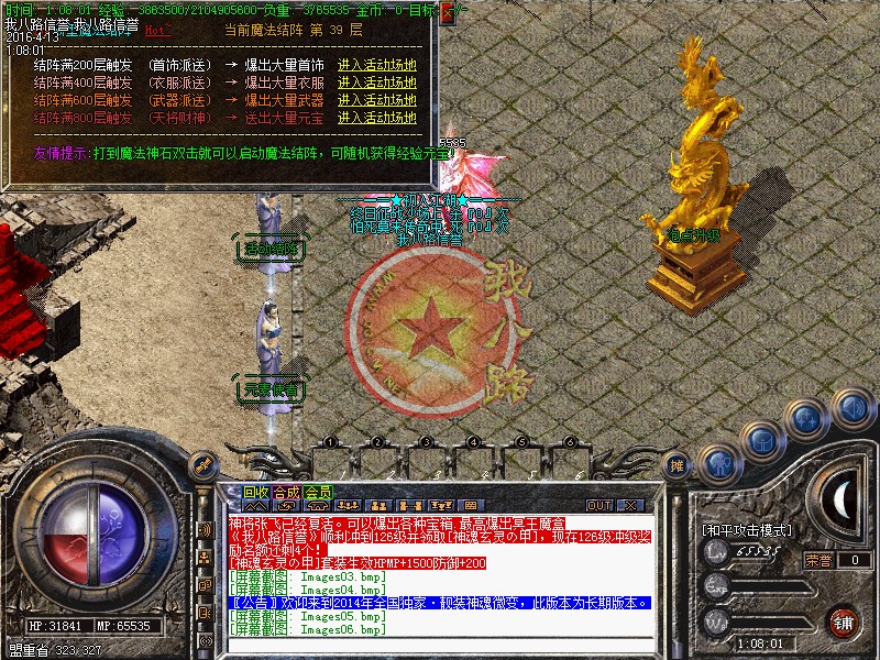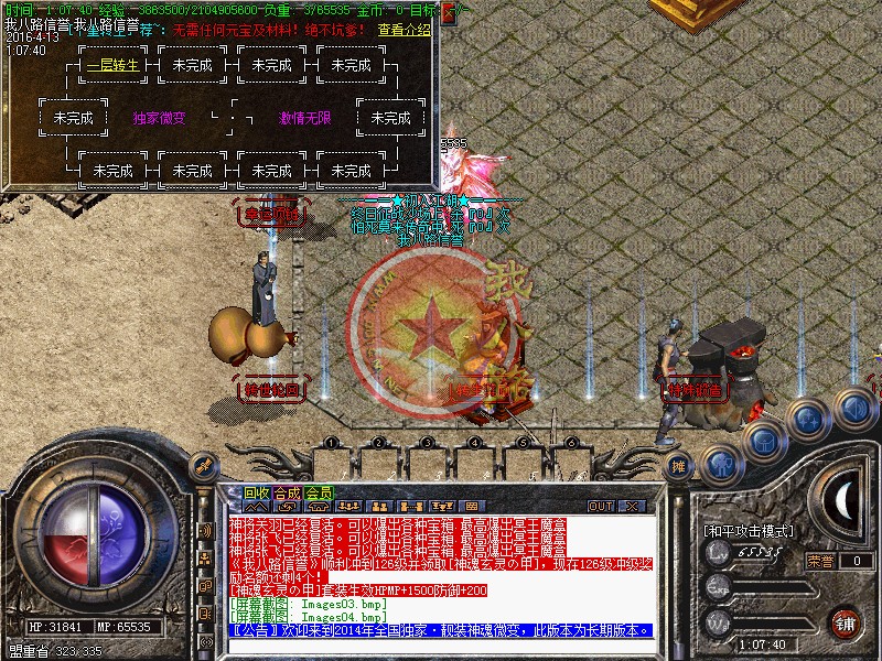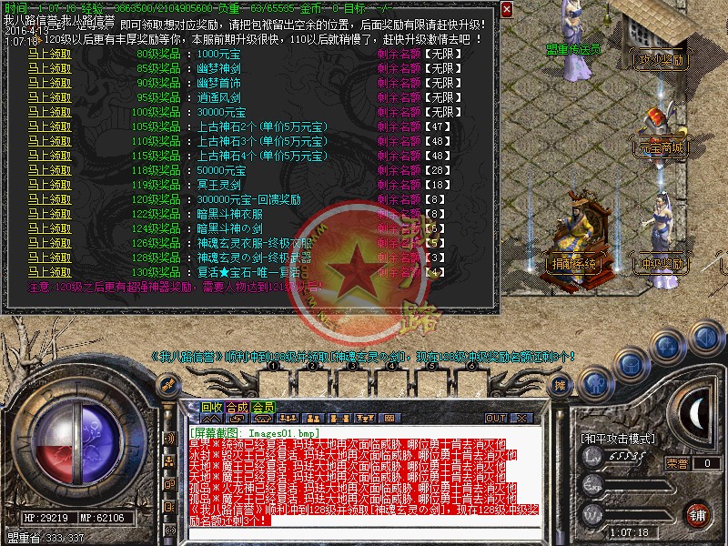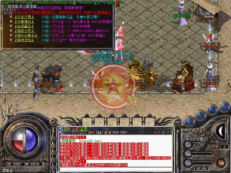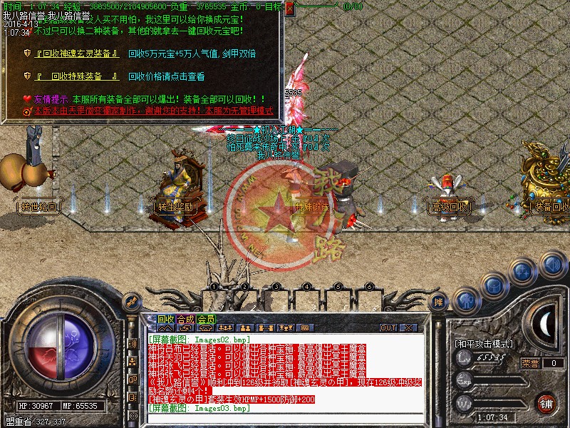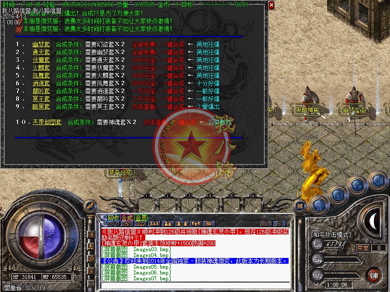 本传奇版本所有装备均可在游戏中获得,越高级的装备暴率越低,但是绝对能暴,短期不能打到只是运气问题。新区奖励350W元宝+城主充值现金返还.老区奖励200W元宝!本服升级快,升级奖励丰厚.每5级奖励一次.新区冲级奖励海量元宝!前期升级非常快,不出一小时绝对能到110级,不会枯燥的泡半天还不能去打装备 !地图超多.BOSS定时定点刷新.暴率高.会员增加BOSS之家.刷全服所有BOSS !请玩家注意刷新时间!活动多多.激情多多【活动魔王】爆暗黑斗神以下装备.散人玩家不再寂寞.游戏体验!增加道士和法师威力.道士召唤牛B宝宝.飓风破强悍.法师火墙.冰咆哮绝对叼!本服元宝回收超高!会员回收加倍!还有高级装备回收哦!不怕装备放仓库浪费!具体查看NPC!等级超过120级,传奇一条龙技术会推出一些新的功能,绝对长久耐玩!
