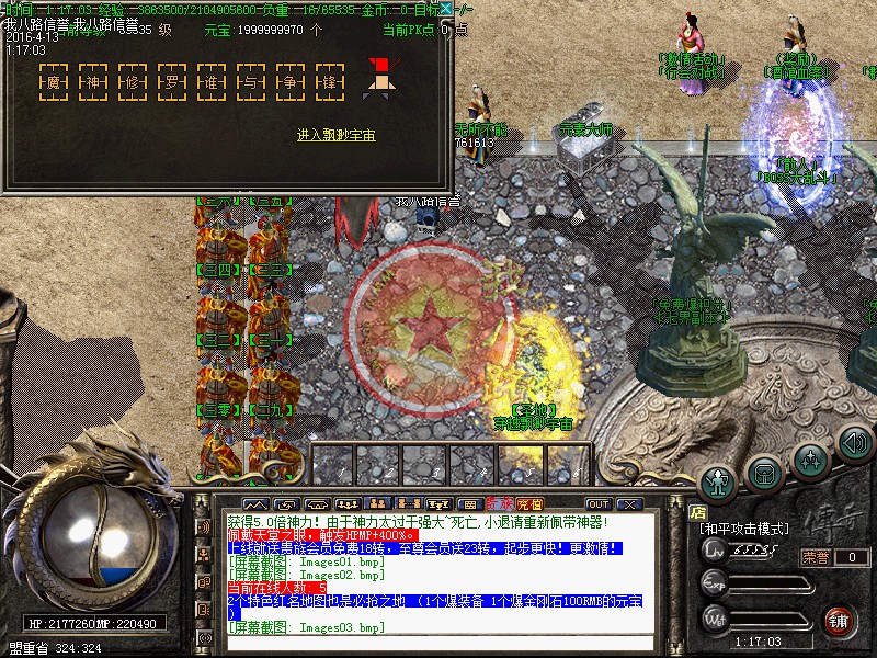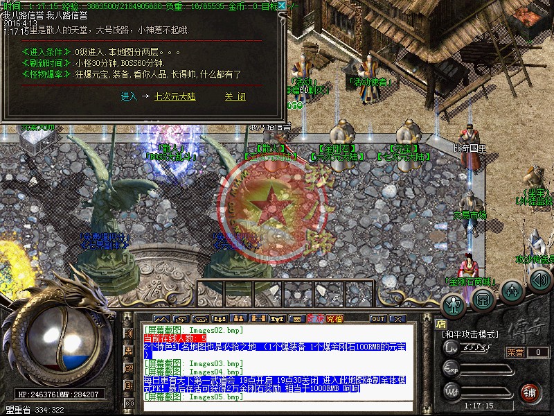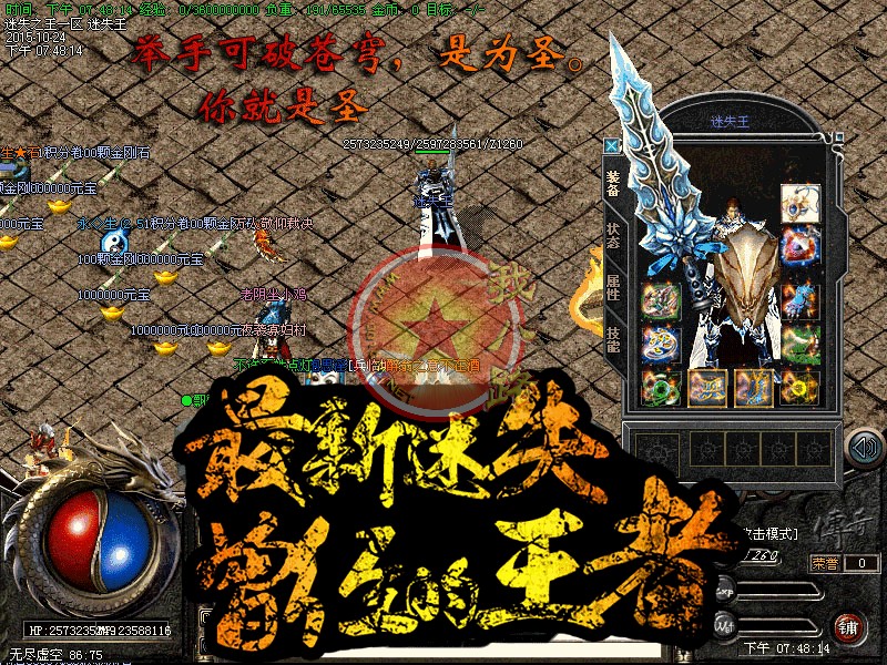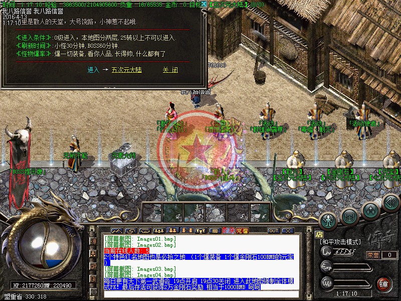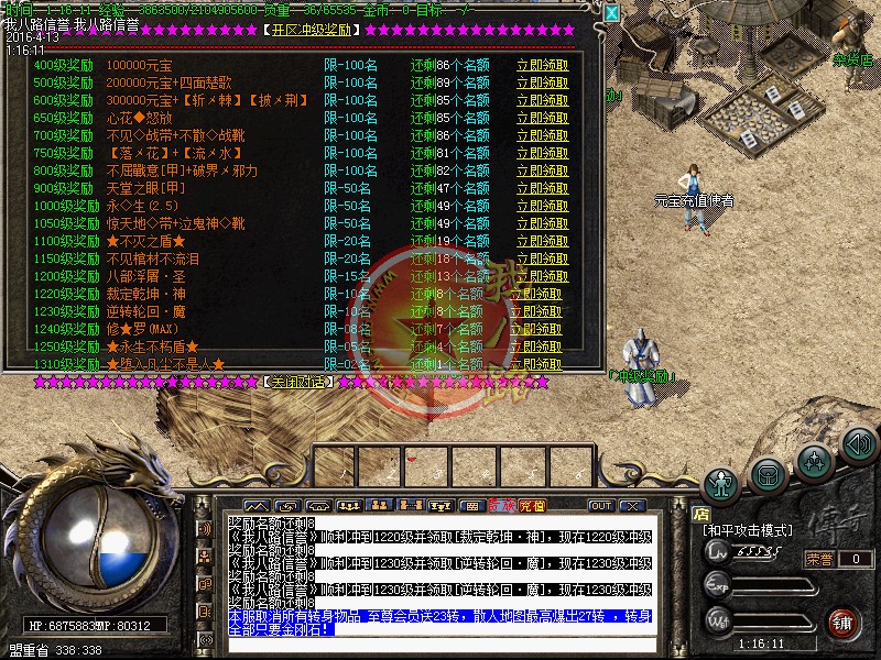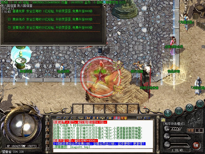 本服上线秒升800级.散人好混.本服是我们传奇一条龙制作团队精心测试.没有任何坑爹漏洞.没有任何隐藏消费.99%地图免费进入.终极地图按[在线时间].不花钱也可以进终极传奇sf一条龙脚本地图.更有免费散人.专爆积分.专爆金刚石 专爆元宝。本服特色是以散人为主的经典巨作.蹲点打野外BOSS.不充钱有时间一样当大哥,请玩家在开区以前下载好补丁.以免开区了耽误您宝贵的时间!本服无托无管理模式。请玩家公平游戏不要开非法辅助。发现一次删号封IP处理、本服充值1:1000000元宝,积分1:20.本服所有充值送百分之百 全服统一比例,公平,公正!