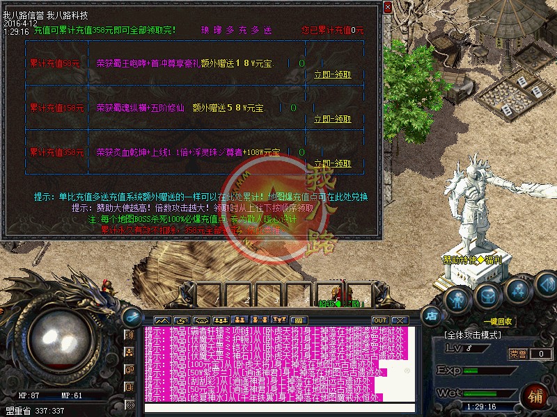 本服所有怪物都有几率爆出RMB出来,完全给予网银一样的充值比例!散人玩家可直接累计领取赞助福利,绝对没有任何拖,无待遇,无比例,长期公正公平稳定开服!每天晚上22.10服务器双超级活动开启,击杀双活动BOSS将会给你意想不到的惊喜!再华丽的语句,都不能决定传奇版本最后的好坏,一切都需要您进入游戏,亲自体验!
