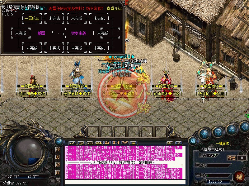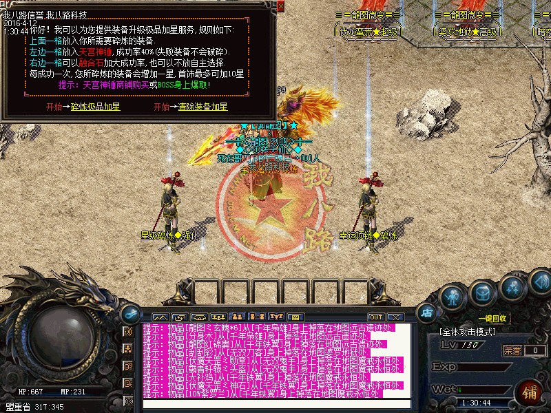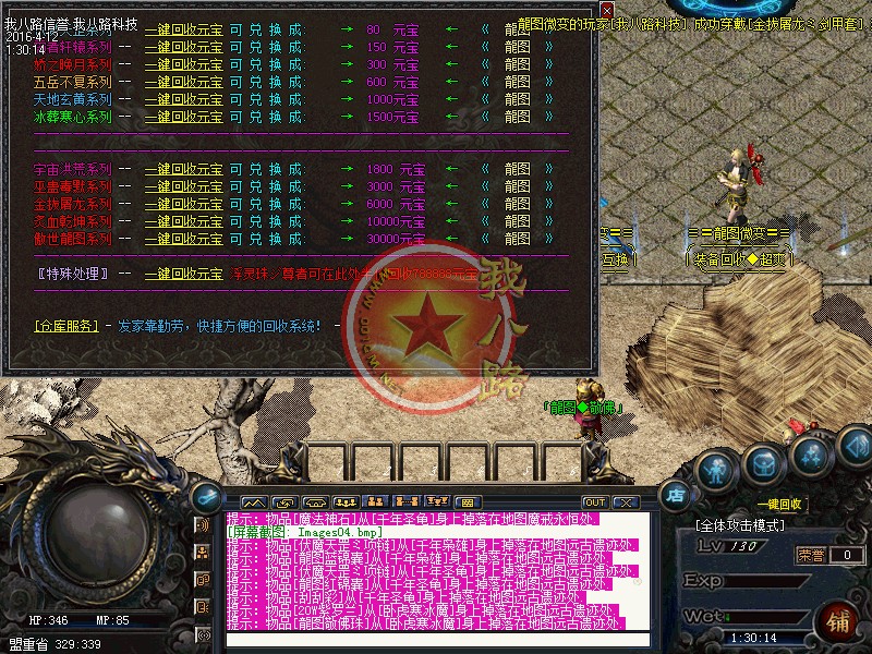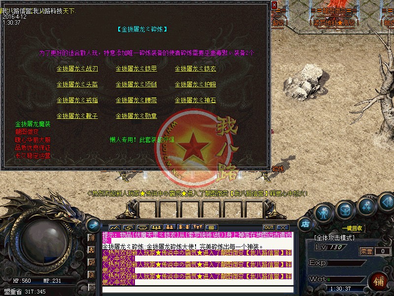 欢迎来到传奇一条龙龍图OL·微变版本,此传奇版本为长期版本。坚决打击一切外挂(发现暗杀,外挂吃药,加速,脱机挂机),一律删号封IP。本F所有装备均可在游戏中获得,越高级的装备暴率越低,但是绝对能暴,短期不能打到只是运气问题。