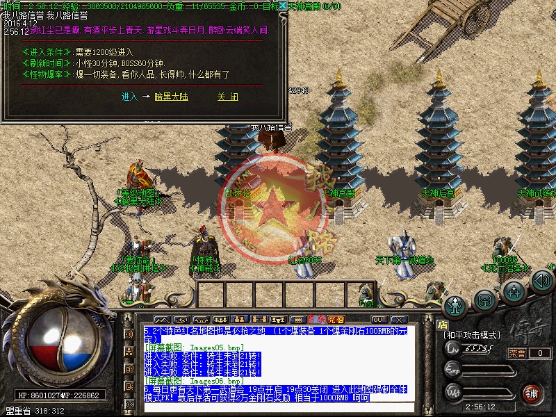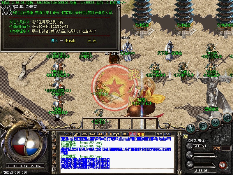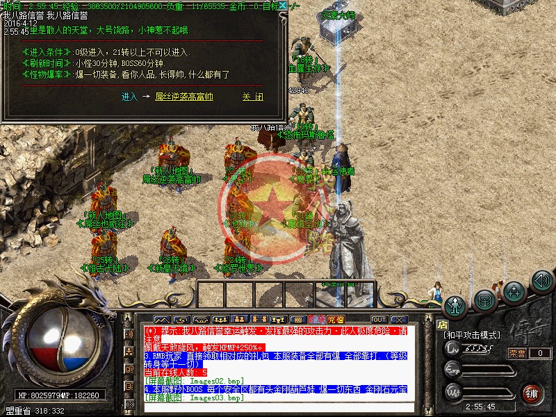 本服野外BOOS 每个安全区都有头金刚葫芦娃 爆一切东西 金刚石元宝,2个特色红名地图也是必抢之地 (1个爆装备 1个爆金刚石100RMB的元宝),每日更有天下第一武道会 19点开启 19点30关闭 进入此地图强制全体模式PK!最后存活可获得2万金刚石奖励 相当于1000RMB 。本服3破装备更是牛逼的没话说 次终极3破单件相对应的破 面巾(破复活)符(防麻痹)宝石(破护身) 聚齐3件触发0.5倍和人物转身攻击叠加.终极3破游戏查询,本服没有任何无用地图。特别是散人地图1到10层 层层惊喜 最后一层我和小伙伴都惊呆了 散人必蹲点传奇sf一条龙脚本地图。充值500 可以免费换取土豪令牌 装逼必备,本服5大终极地图 具体游戏查询。本服终极BOOS 各个地图都有都是固定刷新 散人3 散人6 散人8 散人10 500级地图 700级 800级 900级 1000级 1050级 1100级 转身所有地图 土豪地图BOOS数量是其他的4倍。富翁排行榜 第一名可以免费进入终极地图 每天可领取1万金刚石。传奇一条龙技术增加2种神奇药水只靠打 仙豆.无敌1秒 超神.无敌3秒,本服合区较慢,第三天拿完沙在合区,给玩家充足的时间发展,决不乱合区。增加怪可以直接爆出24转 是所有怪不管大小 增加升级勋章卷轴 爆率 增加RMB体验卷轴 所有BOOS都爆。增加了 28件超级叼炸天的装备为防止盗版模仿不一一列出。