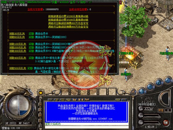 本服在以前的基础上更新了50多张新地图,更新了最强数只[终极]BOSS,27转.28转.29转.30转.31转.一层比一层多N个终极BOSS(31转地图更有全服爆率最高的神龍的存在),还有10多只大BOSS,降低了部分装备佩戴条件,增加了8套究極装备,等级由600封顶修改为3000,加入9种【人形宝宝】(人形宝宝非常智能)更多细节大家慢慢体验!强烈声明:本游戏只卖YB,元宝唯一获得方式就是官网充值,其他均为骗子!许多地方都要用到金币,金条,所以没钱的时候就去奴隶山谷吧.后期25转装备基本上没用了,存仓库吧占位置,扔了吧啥不得!新增装备拆解功能.没用的装备可以拿去分解出珍贵合成材料血舍利!佣兵升满每天可以领取1次3倍经验,配合四倍勋章就是12倍.每次领取经验倍数时间是10小时!一天只有一次机会.运气好1天就可以升满级!请好好珍惜!如果您来的时候俺们服务器已经开放,请不要介意,传奇的路还很长,就这么几个小时不算什么。如果您是玩几天就换F,甚至玩几个小时就换F。那我看您趁早换得了。我们的版本能玩一周甚至半个月.不管你花不花钱.都不会枯燥.呵呵,请细细体味我们的传奇吧。民政局,30分钟刷一只民政局局长,还有神魔之子[终极]的刷新噢。绝对是新区的抢手货!新增加几十种新装备.装备回收.元宝很好打哦!几乎的装备全部可以回收!打到了千万不要丢弃!加入大量新怪物.远古系列怪物.龙之九子系列怪物.新BOSS系列怪物.罕世BOSS系列怪物.终极天魔神魔系列.[魂]系列终极BOSS[真]系列超极BOSS.[统治者]系列等等....增加终极神魔地图.天魔地图.巨人洞.火云府.逐鹿天下等.里面10倍爆率并且有本服终极BOSS.爆一切装备.商城物品等.如果你觉得你运气不好.凑凑元宝进入去试试吧.你一定会收获丰盈的!当然怪物是相当生猛的.当你有足够实力的时候再去吧....增加终极21转.22转.23转.24转.25转.26转.27转.28转.29转.30转.31转.40地图.里面聚齐了本服的所有大BOSS.终极BOSS等等.高级转生玩家的福利之地!!!!!高级转生玩家一定要记得进入!传奇开区一条龙服务声明:请记住我们的永久域名,域名速记.版本新颖,定时更新,打造玩家永远玩不腻的好服!