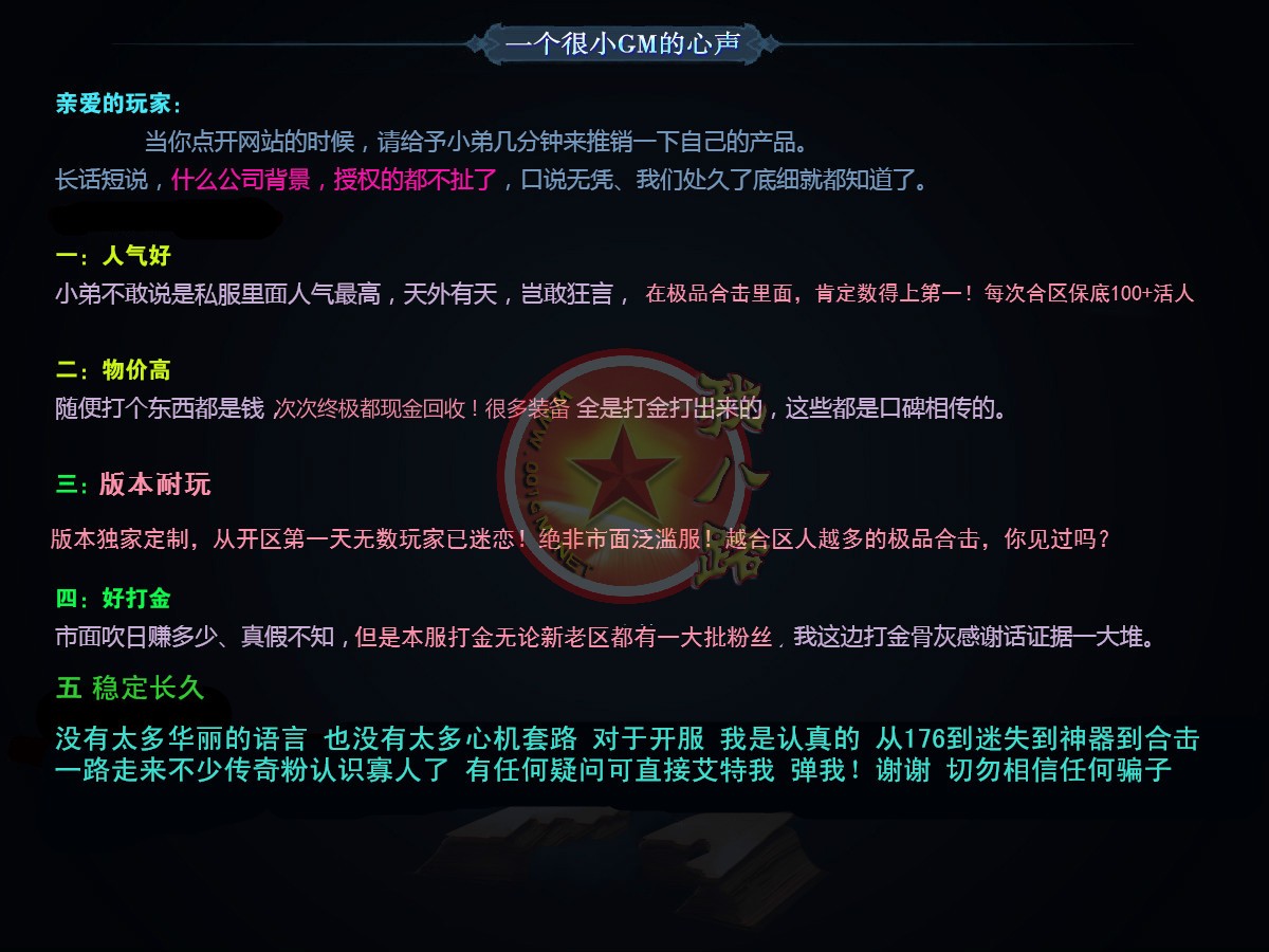 告知:我们从不以低价坑人或骗人,请别轻信低价传奇一条龙,完美的售后才是你开服成功的坚强后盾。并信誉不是我说好就好,是合作好你说好才好。