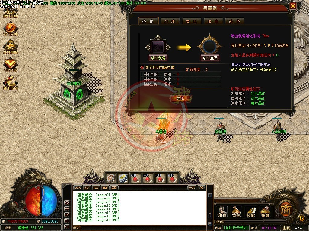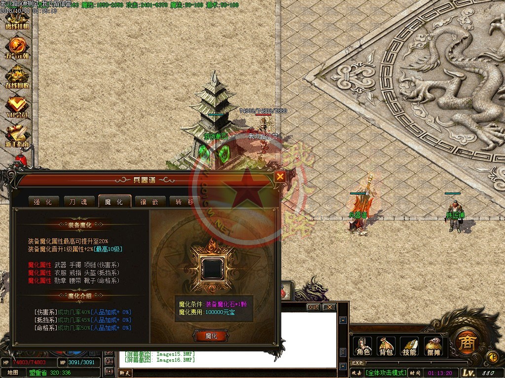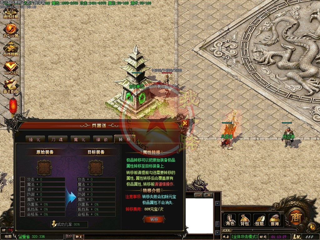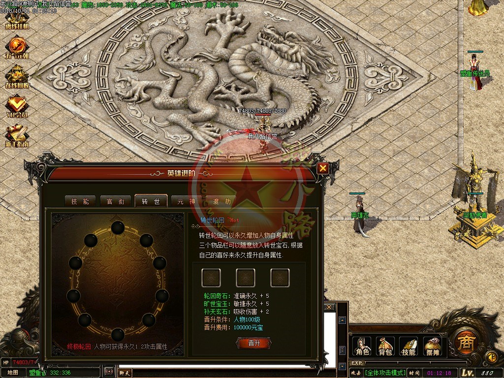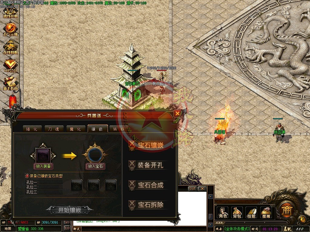 【宝石镶嵌】:所有怪物都会掉落镶嵌宝石,上限十分钟就能全身镶嵌宝石,镶嵌宝石的装备自动提升属性,镶嵌宝石免费合成免费镶嵌!【职业玩法】:本服三职业设置平衡,玩什么职业就看个人手法与喜好,道士在110级.120级.130级.140级.150级宝宝有不同的成长,让道士不再沉默!【极品转移】:极品最高可以强化至488超级极品属性,并且可以转移装备的传奇版本极品属性到更高级的装备上去!!【转生筋骨】:满转可以修炼筋骨,筋骨灵力值提升需要筋骨碎片来提升,最高可以提升5层,元神属性一定程度提高总体战斗力!!【天下第一】:天下第一获得1.2倍攻击,相同等级的人物凭借最高攻击.魔法.道术争夺第一,每6小时清理一次,赶快行动吧!