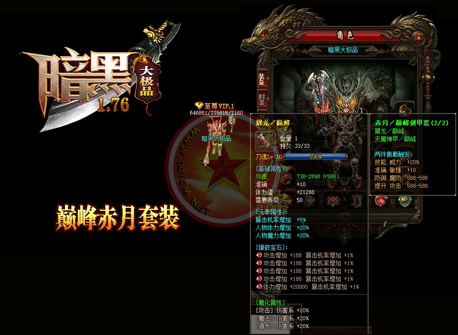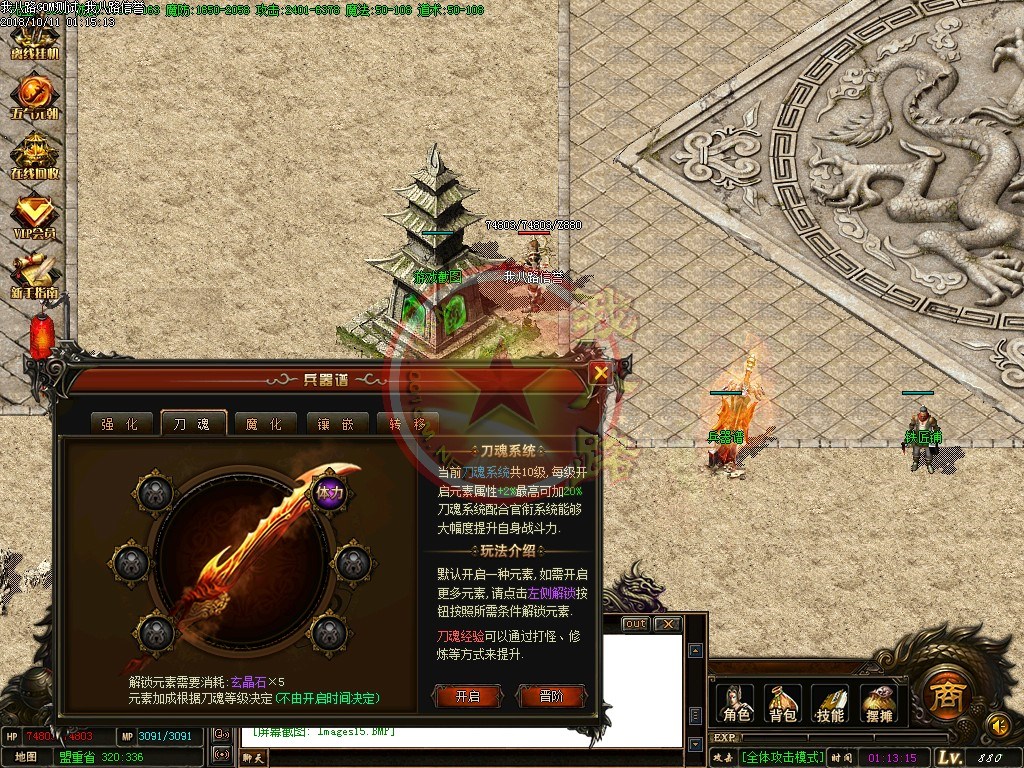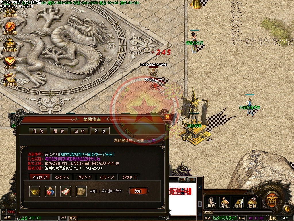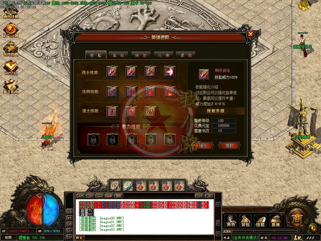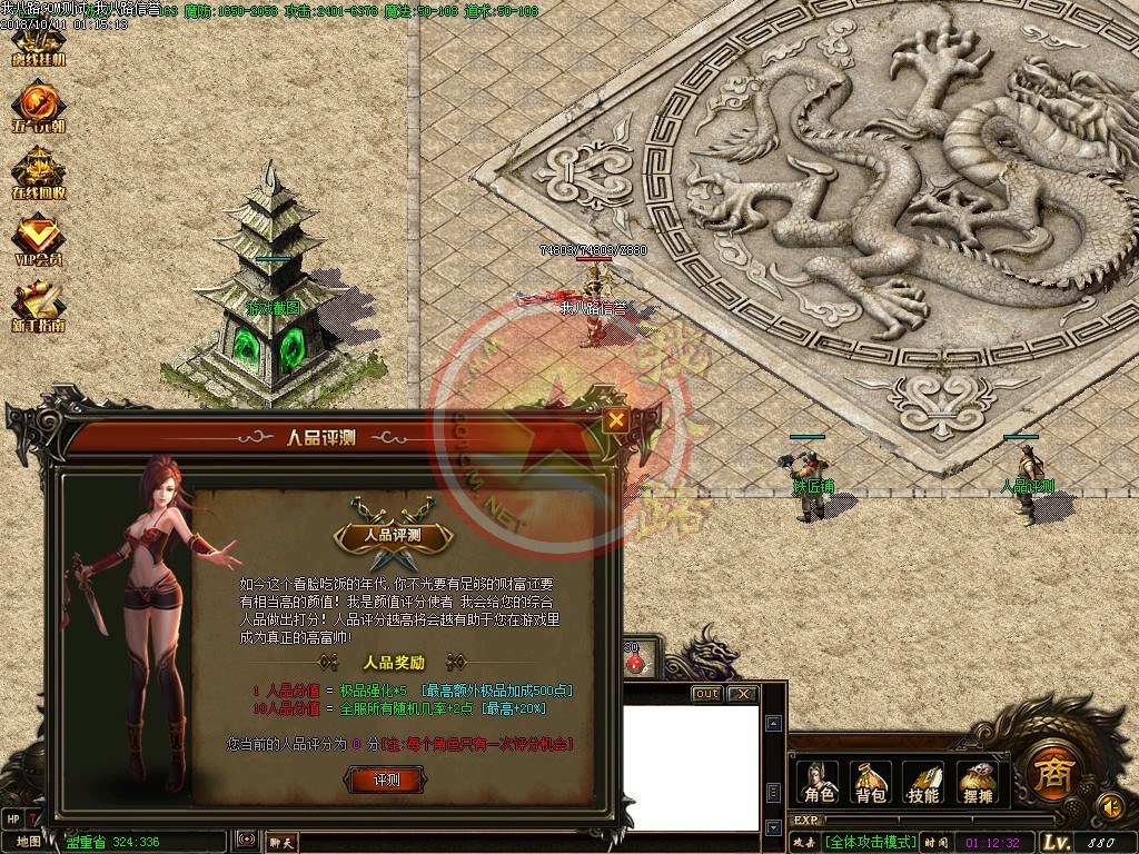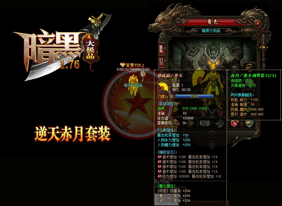 【宝石镶嵌】:所有怪物都会掉落镶嵌宝石,上限十分钟就能全身镶嵌宝石,镶嵌宝石的装备自动提升属性,镶嵌宝石免费合成免费镶嵌!【职业玩法】:本服三职业设置平衡,玩什么职业就看个人手法与喜好,道士在110级.120级.130级.140级.150级宝宝有不同的成长,让道士不再沉默!【极品转移】:极品最高可以强化至488超级极品属性,并且可以转移装备的传奇版本极品属性到更高级的装备上去!!【转生筋骨】:满转可以修炼筋骨,筋骨灵力值提升需要筋骨碎片来提升,最高可以提升5层,元神属性一定程度提高总体战斗力!!【天下第一】:天下第一获得1.2倍攻击,相同等级的人物凭借最高攻击.魔法.道术争夺第一,每6小时清理一次,赶快行动吧!