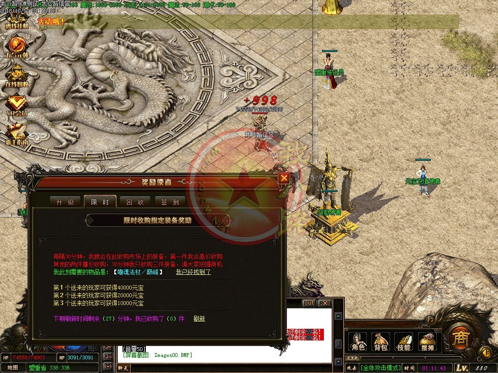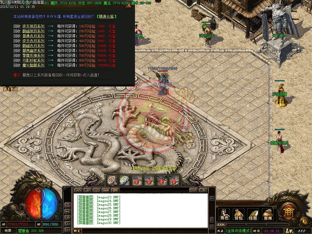 【元宝比例】:本服元宝比例1:10000元宝,网页充值赠送100%,点卡充值赠送80%,另有多充多送优惠活动哦!【攻沙设置】:开区第二天统一自动攻城,新区首次攻沙奖励500万元宝,老区奖励200万元宝,每日重金传奇版本广告,多区连开,确保人气和激情!