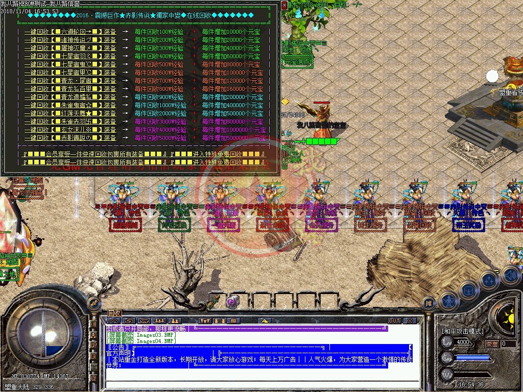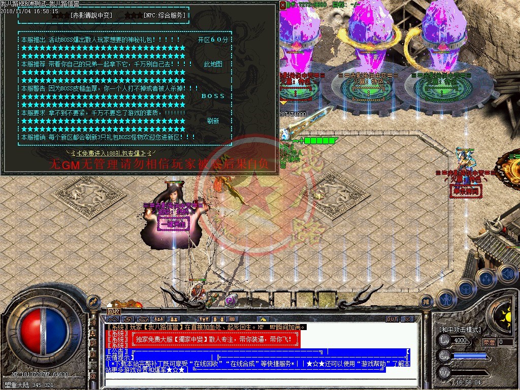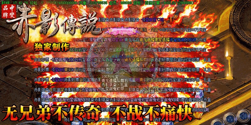 【元宝比例】:1:500万 点卡赠送100% 网银赠送100%!【精彩活动】:全天24小时BOSS活动5分钟触发激情不断.【免费通知】:0元满级 领取所有传奇版本下载奖励全部免费 敢来就敢送.【开区通知】:每天8-18个区,海量广告宣传,保证人气火爆.