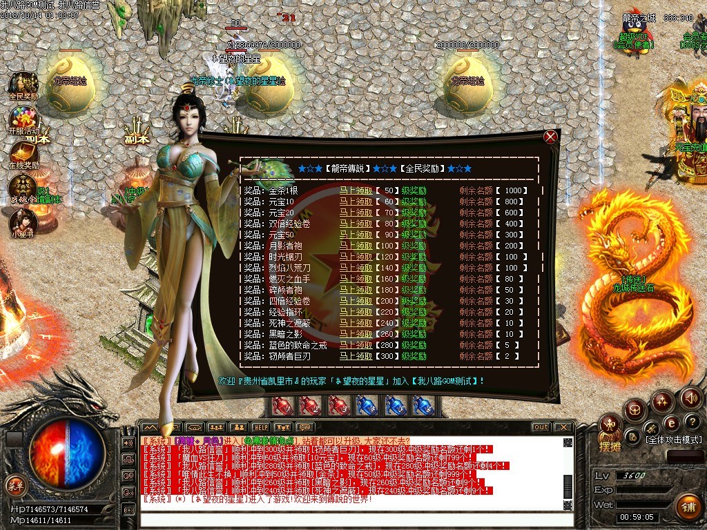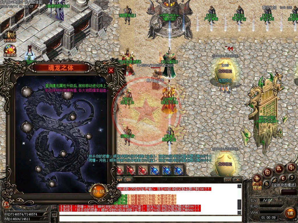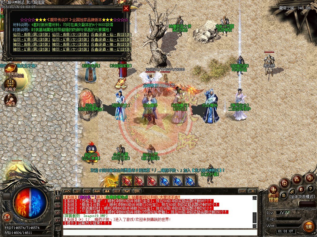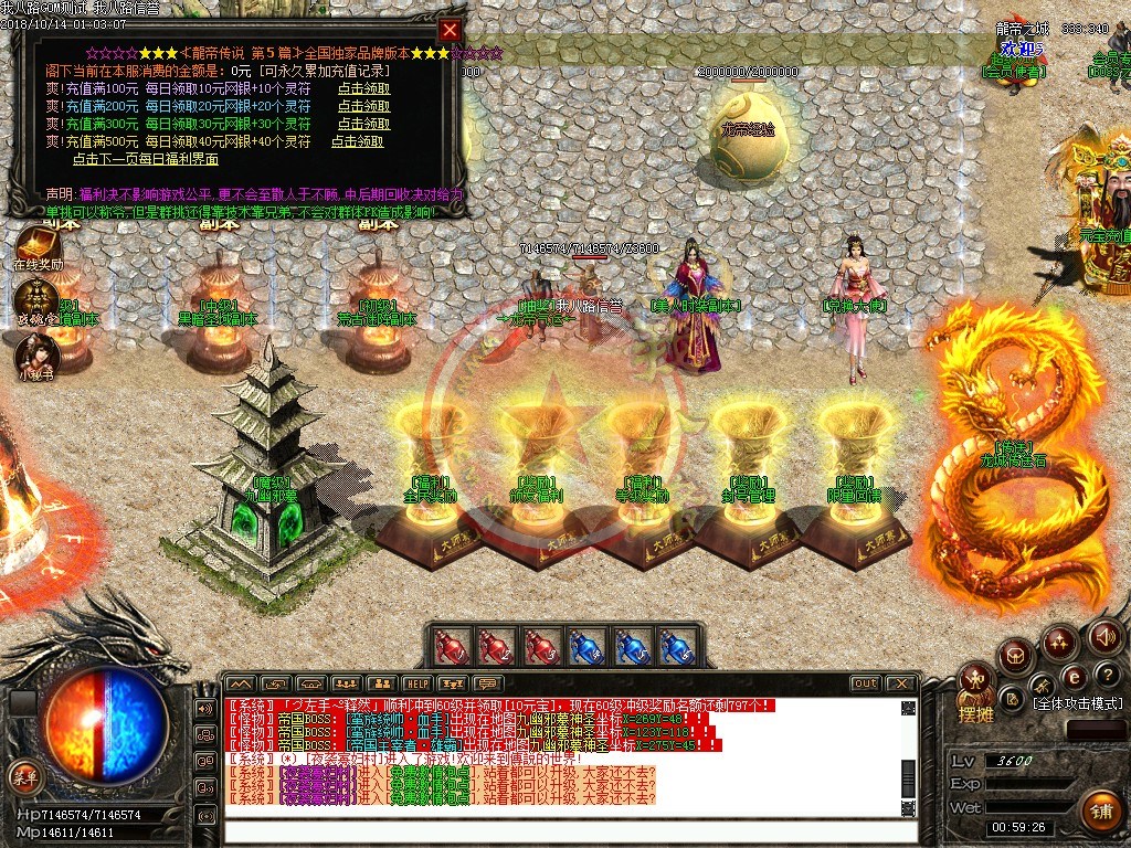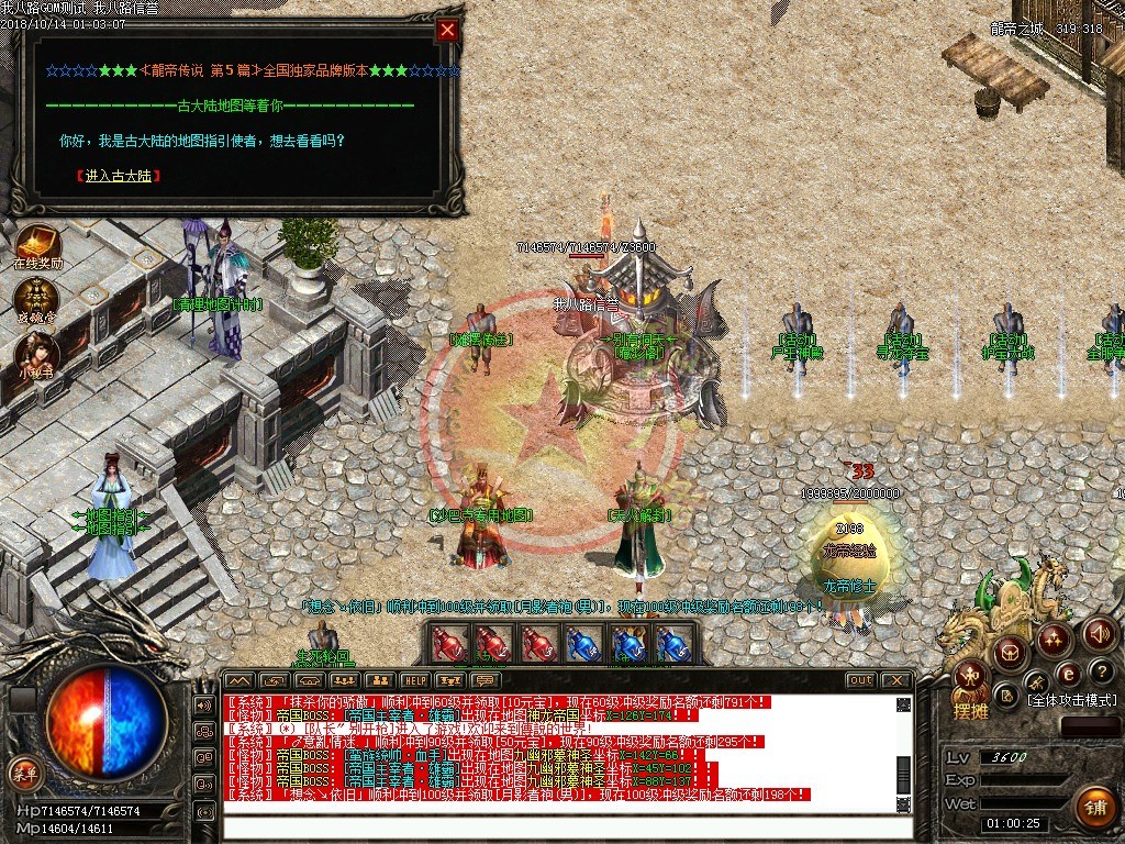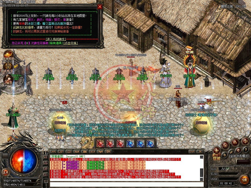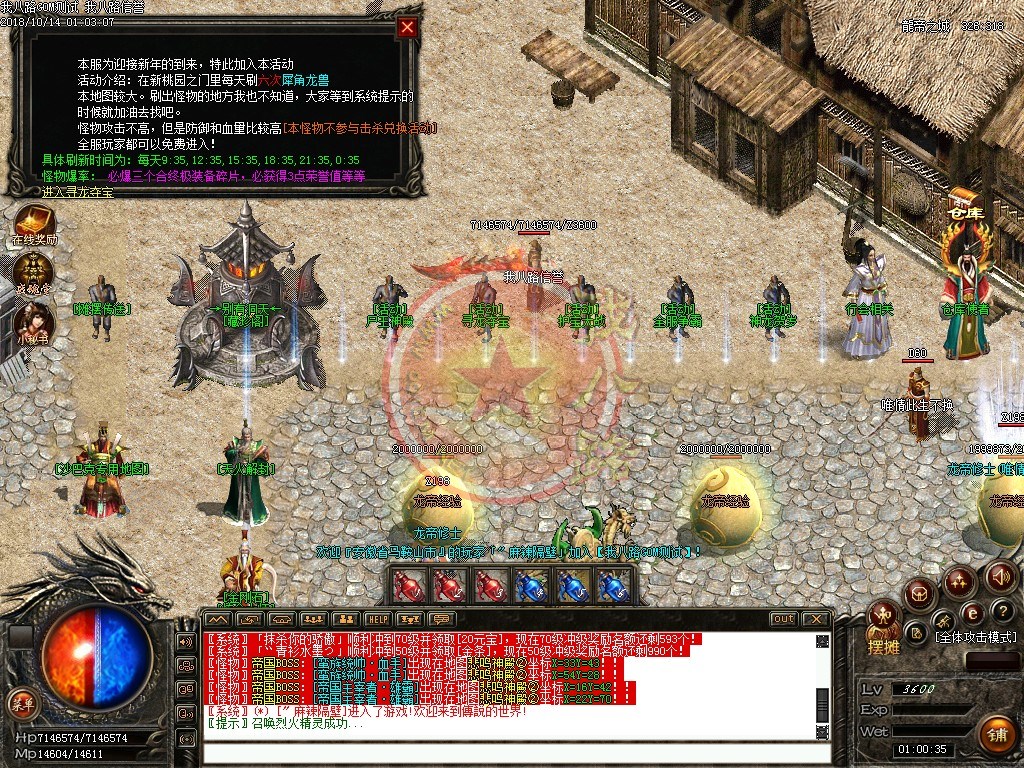 欢迎来到龍帝傳説第四季之齐贺新年.本服由九州网络长久运营,每月定时更新。祝大家游戏愉快!新人玩家请点击大屏幕右侧的小秘书查询攻略,再有不明白的就仔细研究!全新设置道士使用技能已经改为内气施展,无需符和毒药..新区开启后的第2天集体功沙.无需头像.新区奖励168888元宝!老区天天激情抢沙.拿沙奖励元宝5万元宝!