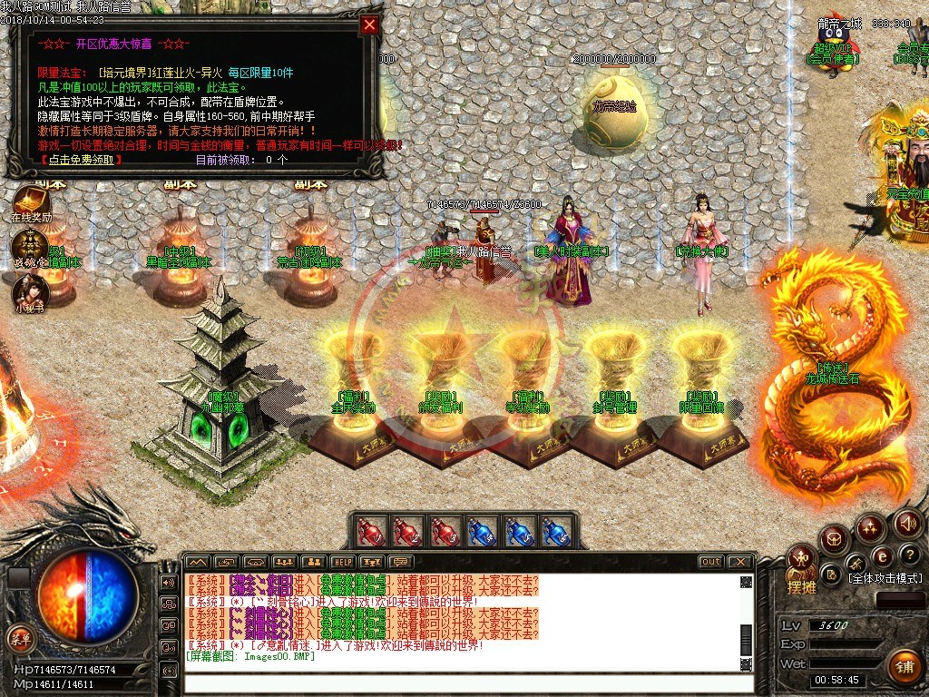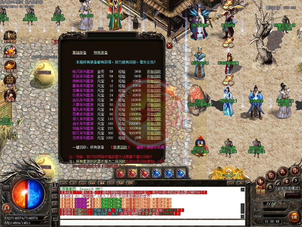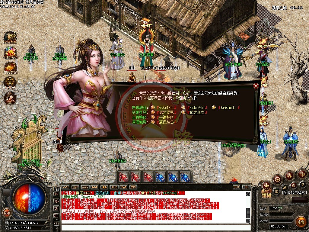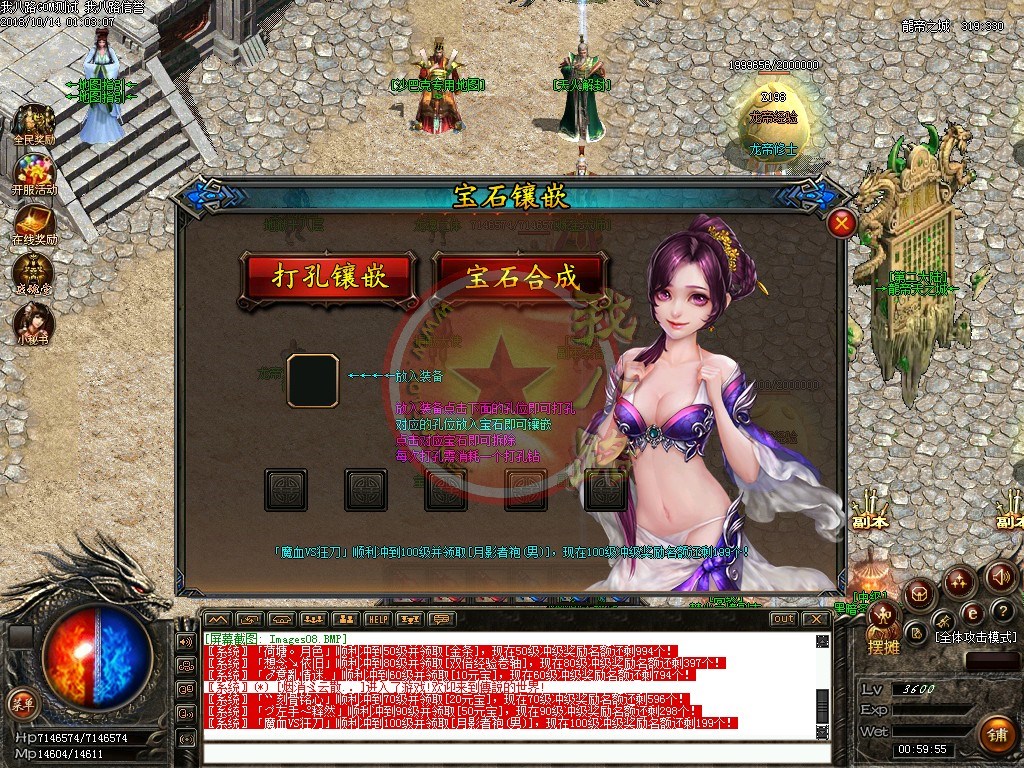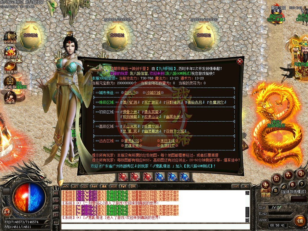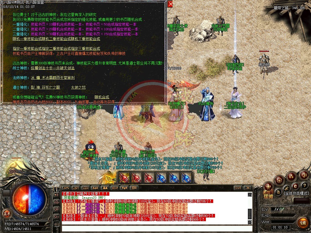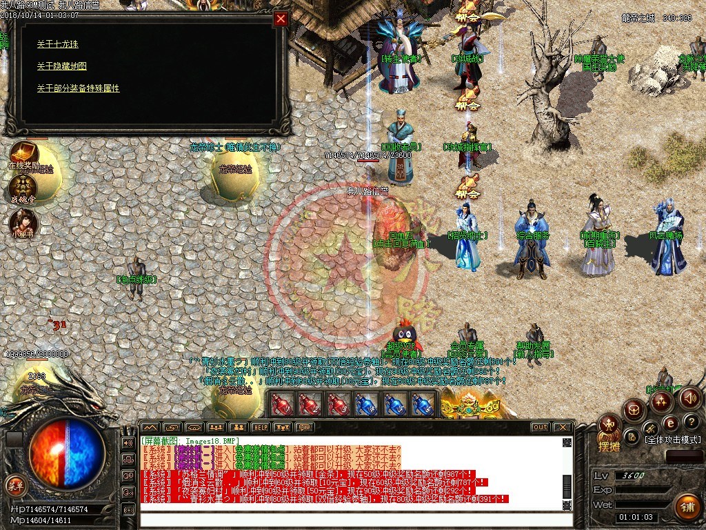 欢迎来到龍帝傳説第四季之齐贺新年.本服由九州网络长久运营,每月定时更新。祝大家游戏愉快!新人玩家请点击大屏幕右侧的小秘书查询攻略,再有不明白的就仔细研究!全新设置道士使用技能已经改为内气施展,无需符和毒药..新区开启后的第2天集体功沙.无需头像.新区奖励168888元宝!老区天天激情抢沙.拿沙奖励元宝5万元宝!