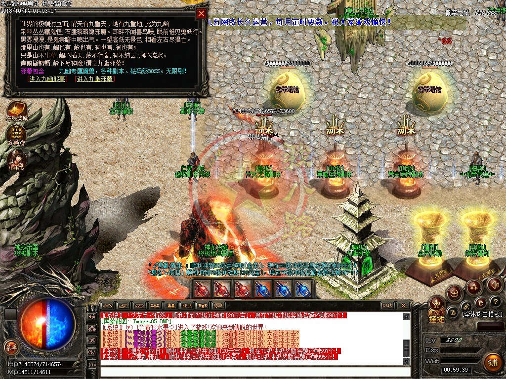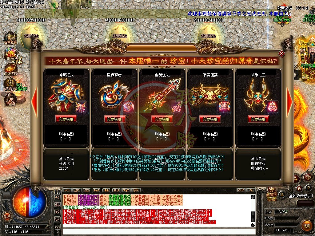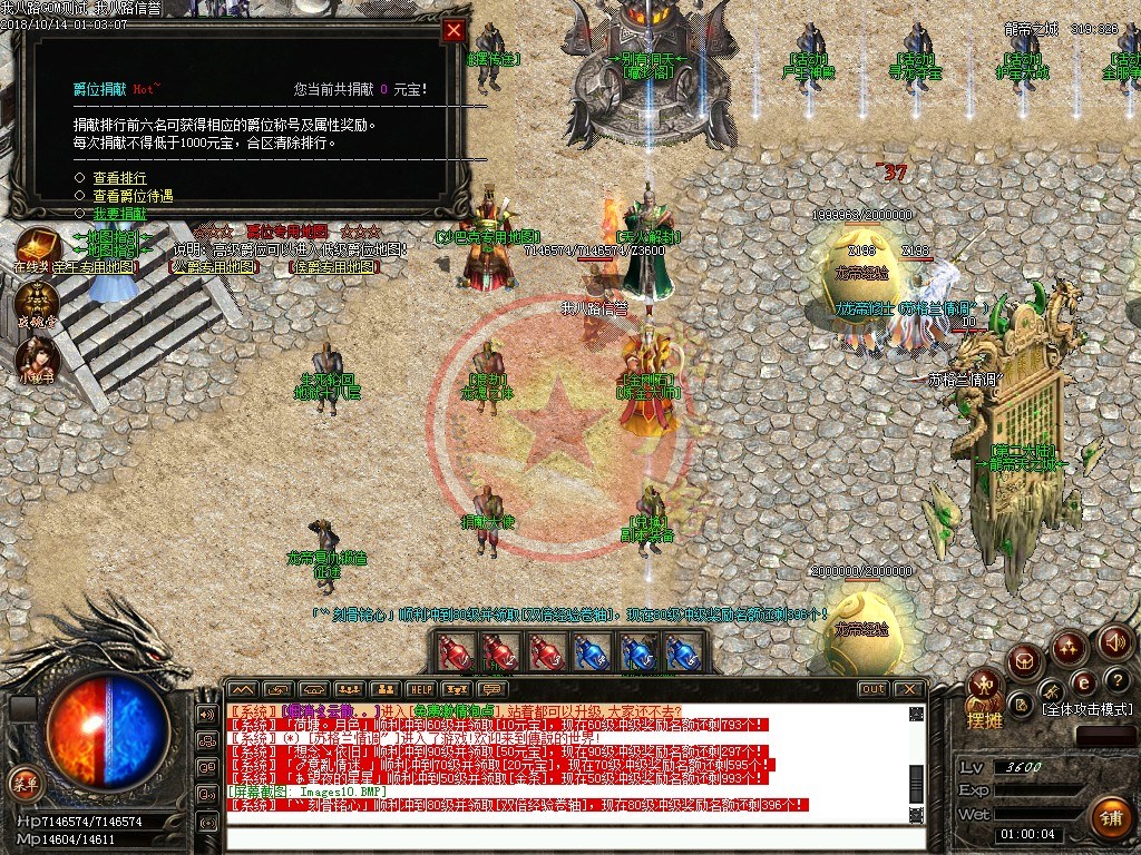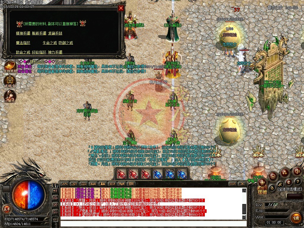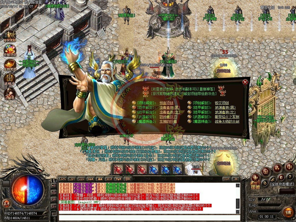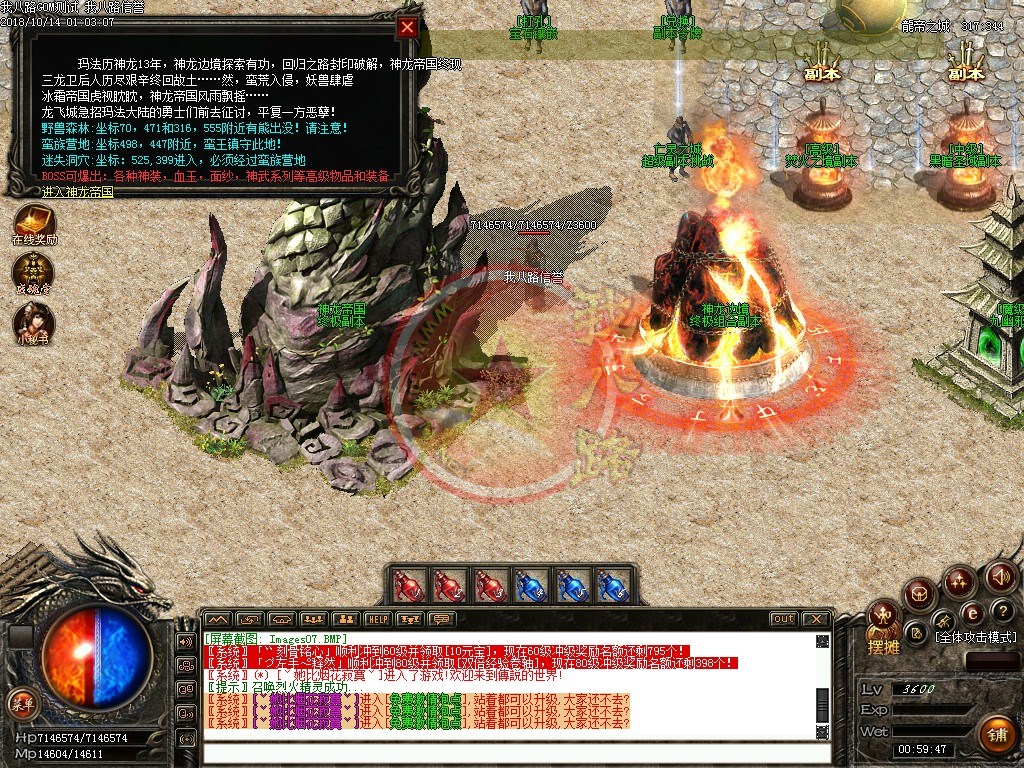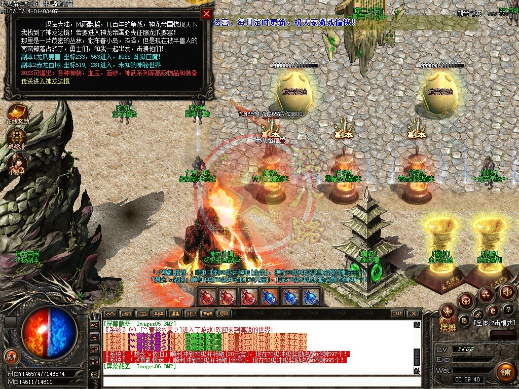 欢迎来到龍帝傳説第四季之齐贺新年.本服由九州网络长久运营,每月定时更新。祝大家游戏愉快!新人玩家请点击大屏幕右侧的小秘书查询攻略,再有不明白的就仔细研究!全新设置道士使用技能已经改为内气施展,无需符和毒药..新区开启后的第2天集体功沙.无需头像.新区奖励168888元宝!老区天天激情抢沙.拿沙奖励元宝5万元宝!