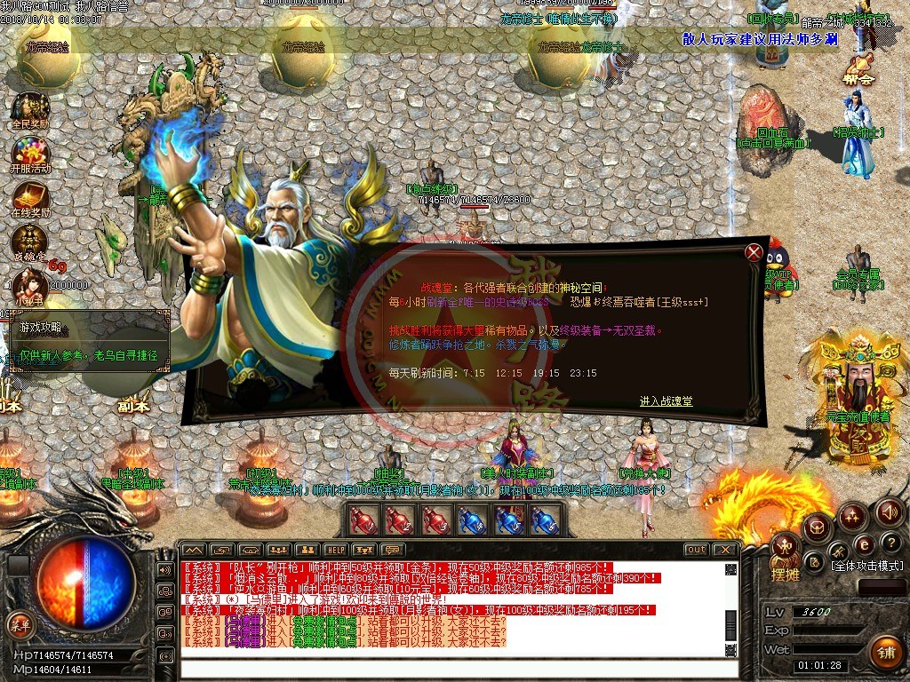 在写详细游戏攻略之前建议玩家上服别急着做任何事情先仔细浏览一下土城所有的NPC功能,这样更容易 上手。磨刀不误砍材时..简介:游戏采用复古+动态地图。很多独家的地图非常梦幻,但不夸张,不详细举例。怪物有一定难度, 非快餐玩家可以征服的。散人玩家就靠时间多,所有的一切均可得到,建议法师道士起步!升级:RMB玩家建议上线直接[金刚石][炼金大师]处 点击{打听金刚石的秘密} 然后锻造金刚石-200 金刚石/ 随后使用传奇私服版本金刚石兑换四倍经验勋章 配合[兑换使者]处兑换四倍经验卷 去[泡点练级]的赤焰 之地刷高级经验猪升级到220级(5分钟).领取开服活动的冲级狂人奖励。前期能最快领取的第一时间 领取所有的开服活动所给予的奖励.