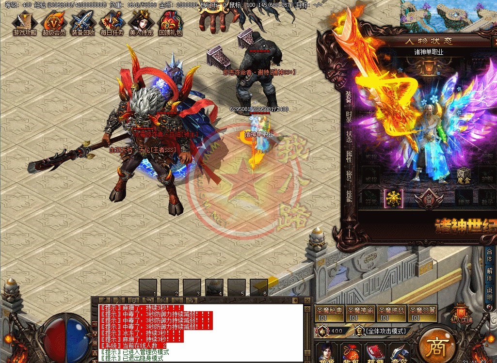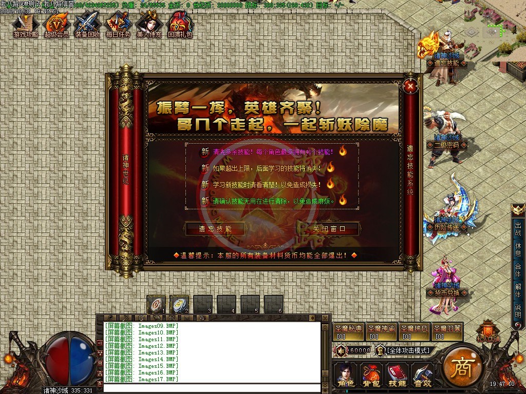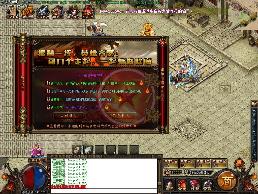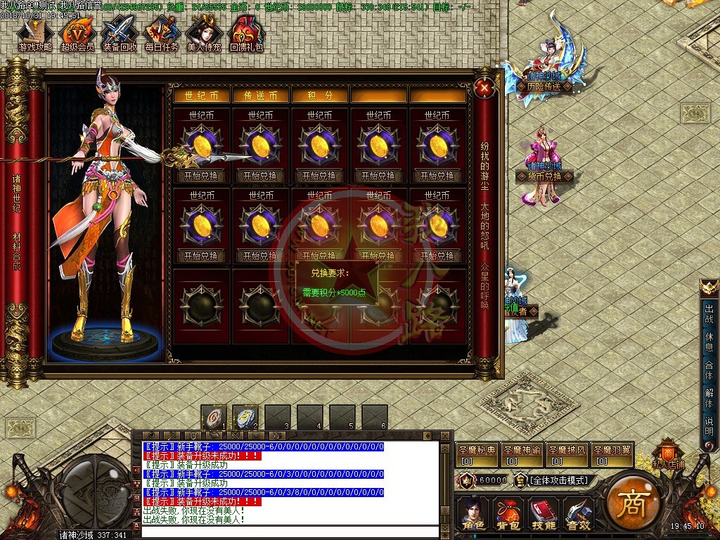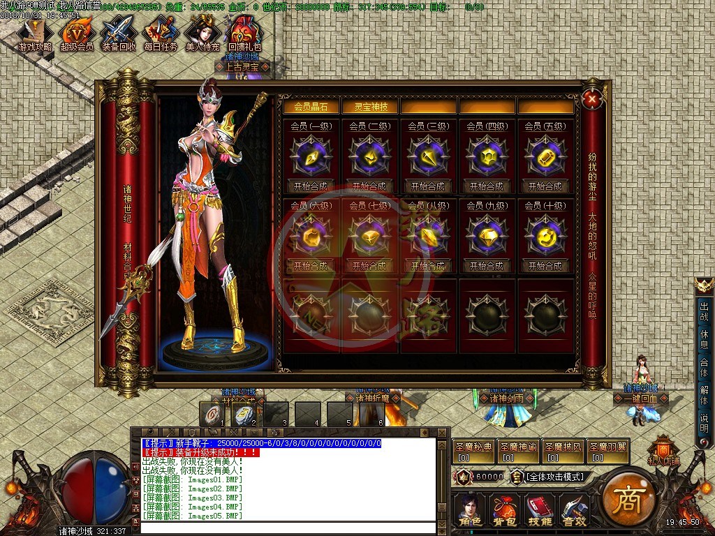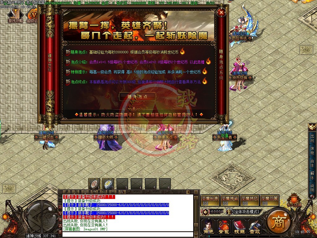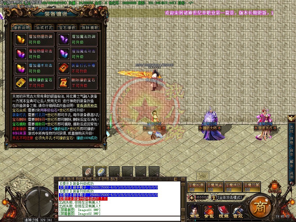 欢迎来到诸神世纪单职业第一篇章,版本长期更新,延续着一切靠打的原则,还原最真实的传奇游戏乐趣。游戏充值比例,1:1500、网银1:3000、请勿相信传奇广告代理游戏中自称为管理员的骗子。第一大陆里等级突破需要诸神之灵,诸神之灵爆了直接在身上,只有去NPC那才能查看哦新区开放第二天晚上准时举行沙巴克攻城,首届城主奖励60万世纪币+20万积分,老区每天拿沙奖励20万世纪币+5万积分。