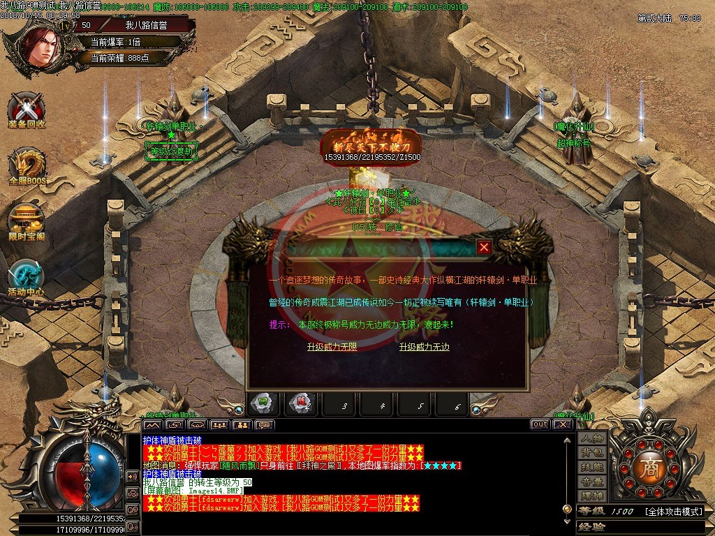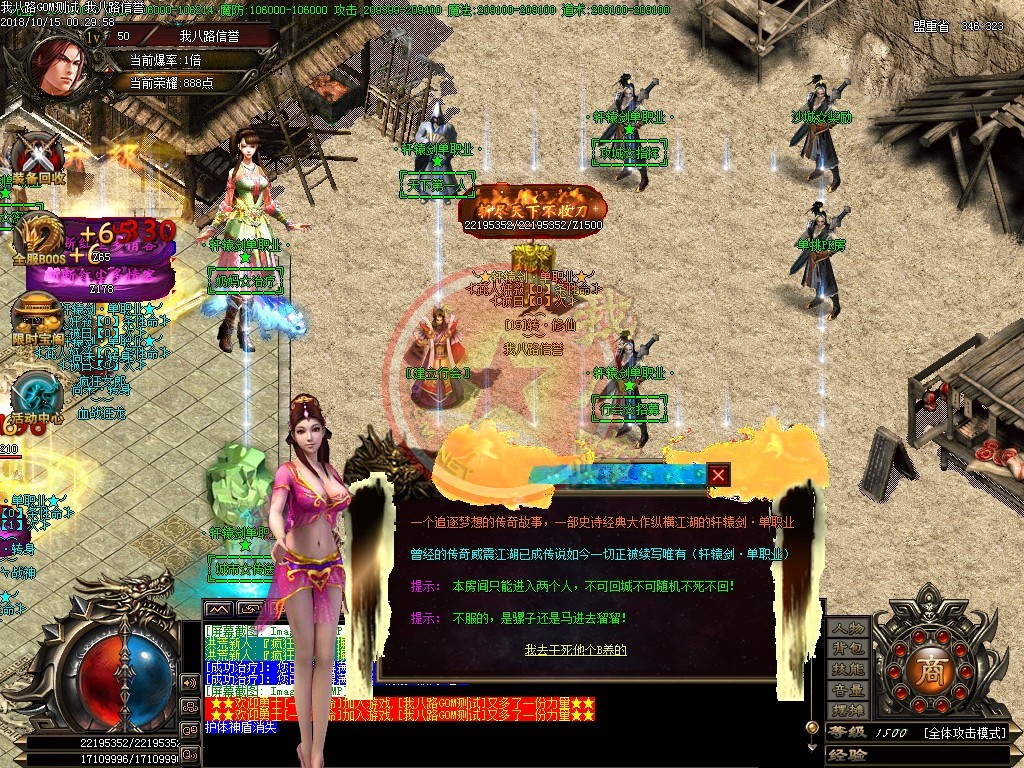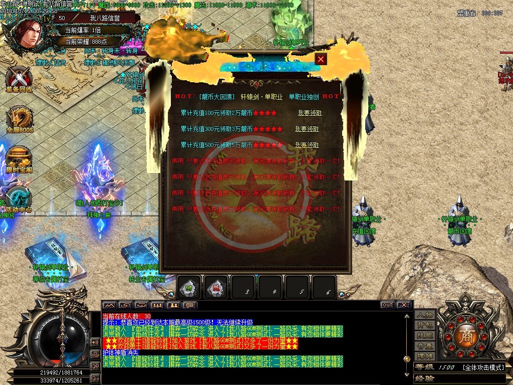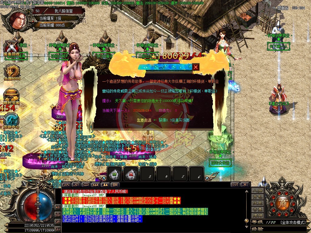 本服强烈打击外挂脱机,发现一次封号处理,多次发现封机器码及降0级0转生,使用小号试挂,同IP大小号全部删除。空白名字,定期清理,请玩家勿建空白名。每天四区,新区准时准点开放,每日至少万元广告,人气区区饱满,,如果大家觉得本服不错,请介绍给你的朋友。年度最具GM体验特色单职业,活动超多,终极装备与人民币直接在游戏活动BOSS中可以爆出,奖励人人可抢。合区后帐号错误,请在帐号后加a,如果仍然有误,则改为加b、c、d,若帐号长度已满10位,无法在后面加字母,则将最后一位改为a、b、c、d多试几次。轩辕剑单职业第二季,独家,激情,长久,耐玩,散人的天堂..