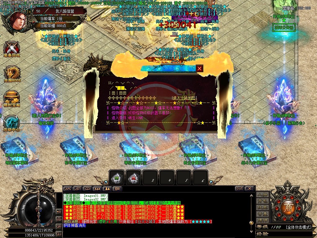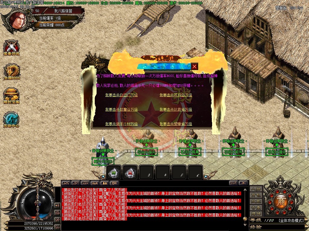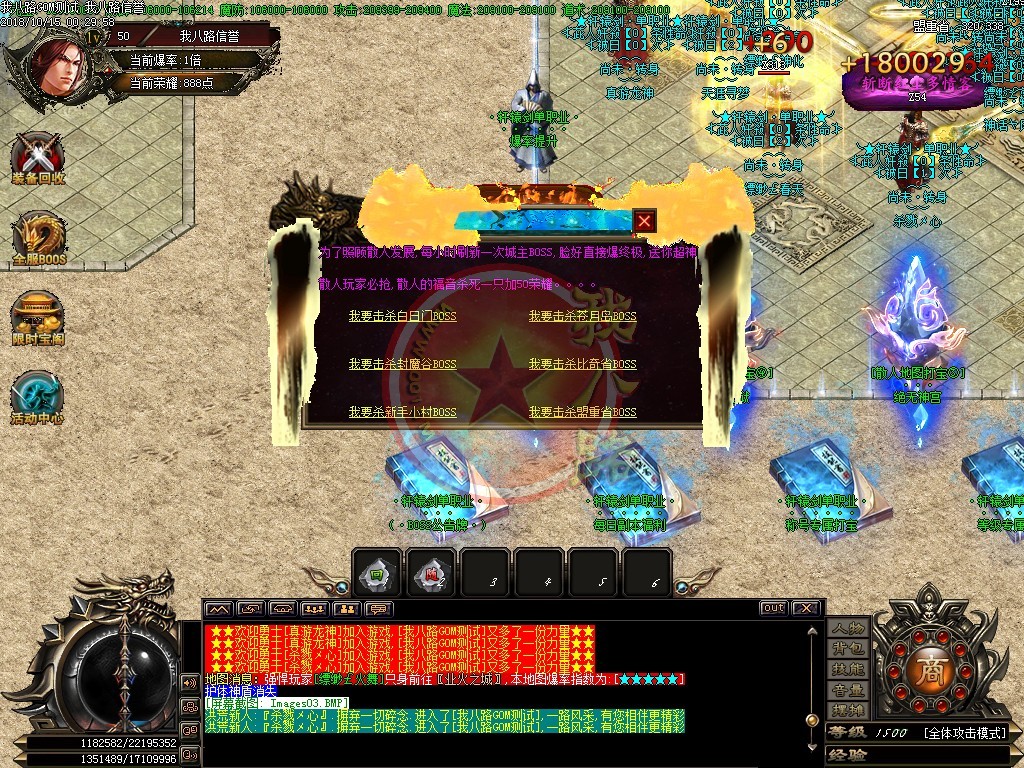 历时半年打造,最具特色单职业版本,全部装备靠打,所有装备0级佩戴,打到就是赚到,真正散人服。本服为单职业特色版本,PK技术全新玩法,不变态,无秒杀,PK畅爽刺激。本服加入GM体验大量最新玩法,小怪与BOSS均可爆出高级装备与材料,人人可拿终极,真正的散人服,只要花时间一切都有。
