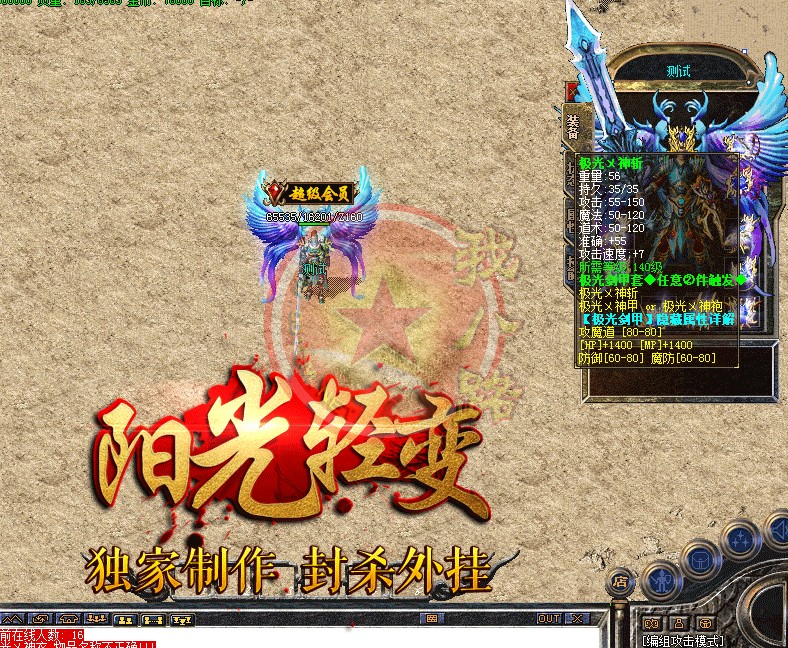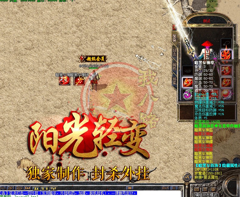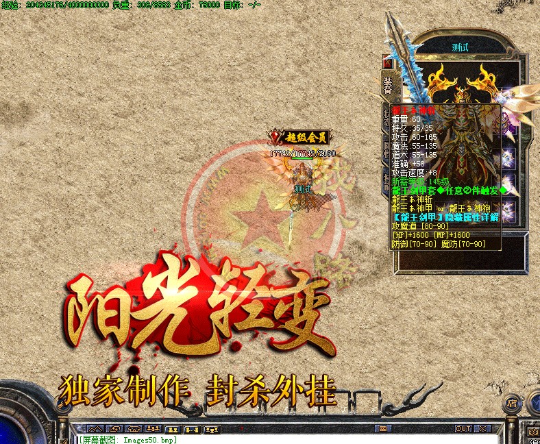 本服是无GM模式,官方网站:请下载完整补丁体验游戏乐趣..本服禁止建立空白人物名,会不定期删除空白名人物,禁止加速外挂,开外挂加速系统检测到就进监狱!本服采用传奇私服架设高端千M服务器,速度流畅,激情无限,新区天天开,惊喜天天有.阳光传奇重金聘请资深游戏策划主创及专业美工人员,历时半年多创新修改,呕心沥血制作,终于与大家见面。