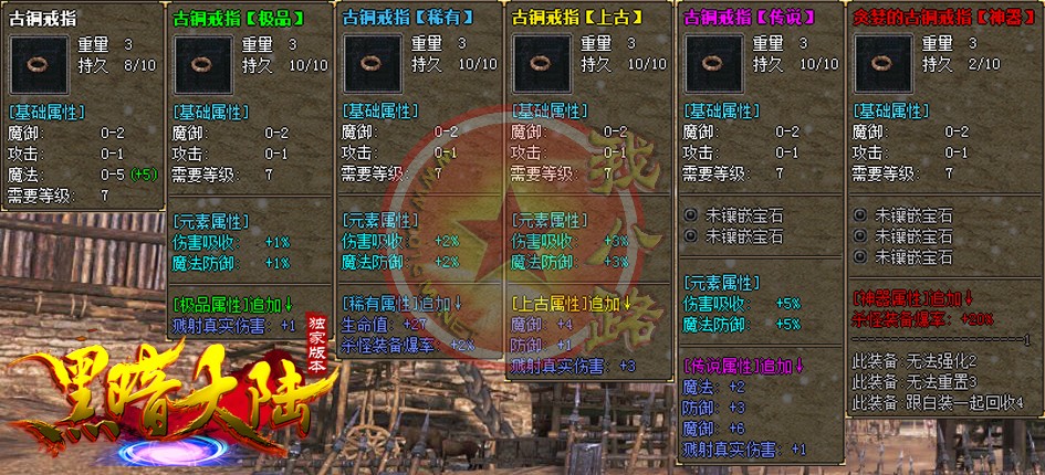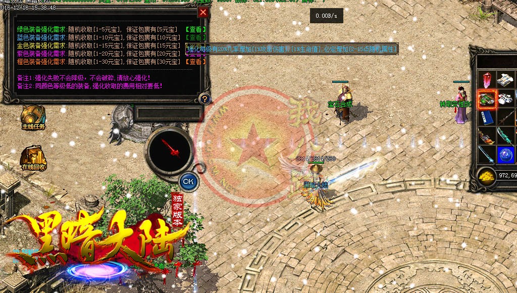 10.高手进阶:装备强化,属性重置,祝福油幸运+10,技能合成,宝石镶嵌,都能提升自身战斗力!装备强化:土城318.321处可强化装备,最高将装备强化+100(强化给予属性随机,装备越好越高) 属性重置:土城328.344处,装备附加黑暗大陆属性随机给予,不满意的属性可以重置《只收金币》!祝福幸运:所有怪物都可爆出“祝福油”“超级祝福油(可合成)”+10幸运最大攻击输出.技能合成:土城332.344处,100书页可随机换取一本技能《终极技能也不奇怪》!宝石镶嵌:金色以上装备,随机附加1-3孔,可镶嵌宝石!宝石可三合一!