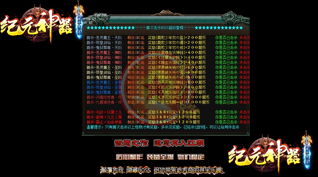 装备全靠打 地图免费进 BOSS打不完..2019《九龍杀★神器》全新独家玩法,上线送宝宝,BOSS零防御!网银充值1元获得20000元宝+20龍币+4充值点(4积分).更新到20转神级套装、25级神器盾牌、终极召唤令、上古回血石。第二天合区,沙奖28级武器1把+500W元宝+5000龙币+2000积分。更新了25件限时奖励,所有限时传奇私服制作奖励增加到2万元RMB。第二天合区,沙奖28级武器1把+500W元宝+5000龙币+2000积分。首沙、战区、月区(188-1888元现金红包),沙巴克专署图5倍爆率地!公司运营 绝无跑路风险 我们不虚张声势 装备保值才是真理..定制封挂插件 完美封杀一切外挂..新增别墅,别墅在手,装备我有。数量有限。售完为止。大家别错过!【官方担保】本服提供交易担保群①: